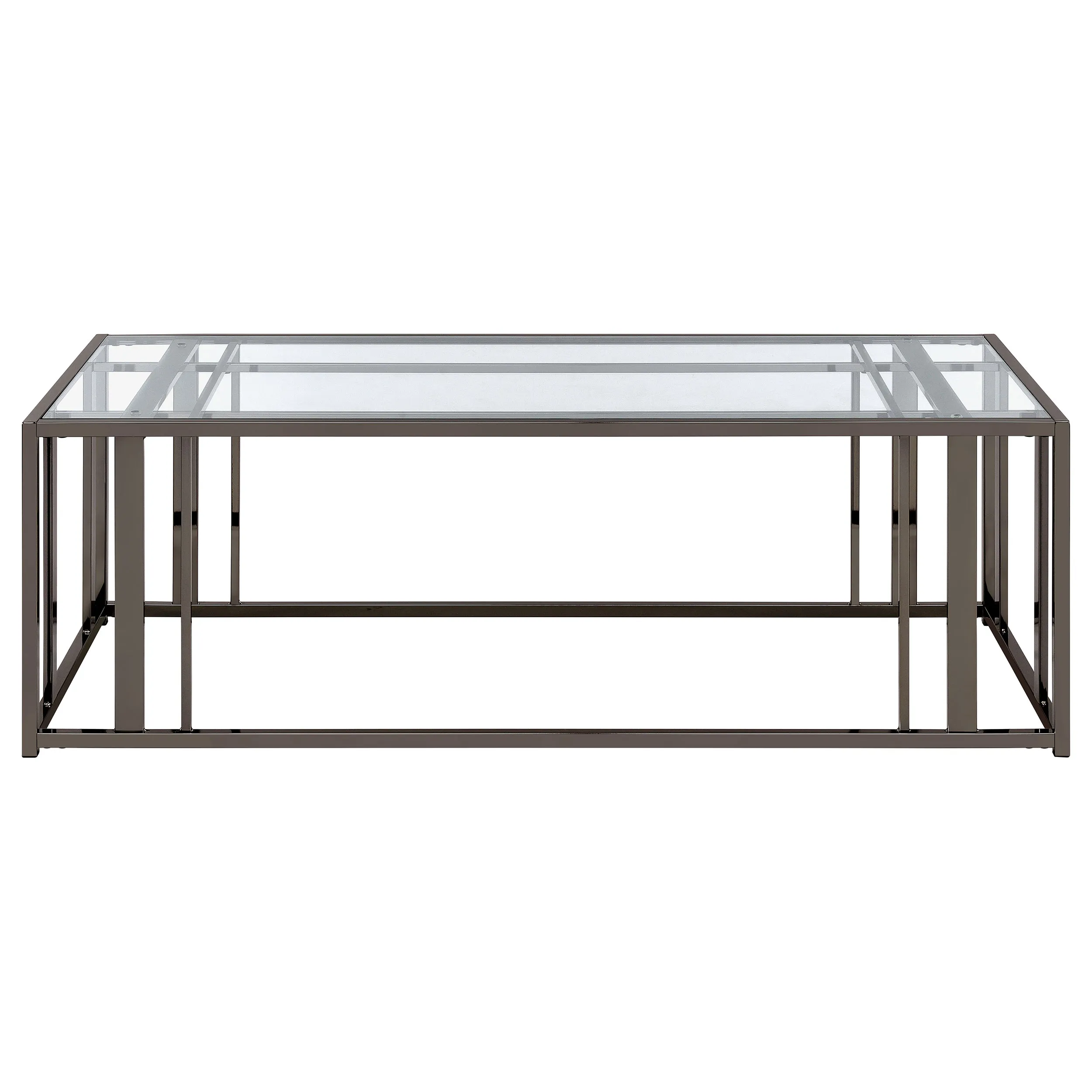 Add a crisp look of linear styling in a coffee table that completes a modern living space. Choose this metal and glass rectangular coffee table to update a family room or living room with bold style. A geometric motif adopts a cage-like openwork base made of woven black nickel finished metal, leaving a striped effect that’s optically fun. A plastic glide on each corner protects flooring. With a sparkling clear tempered glass top, this rectangular coffee table sets a new standard.