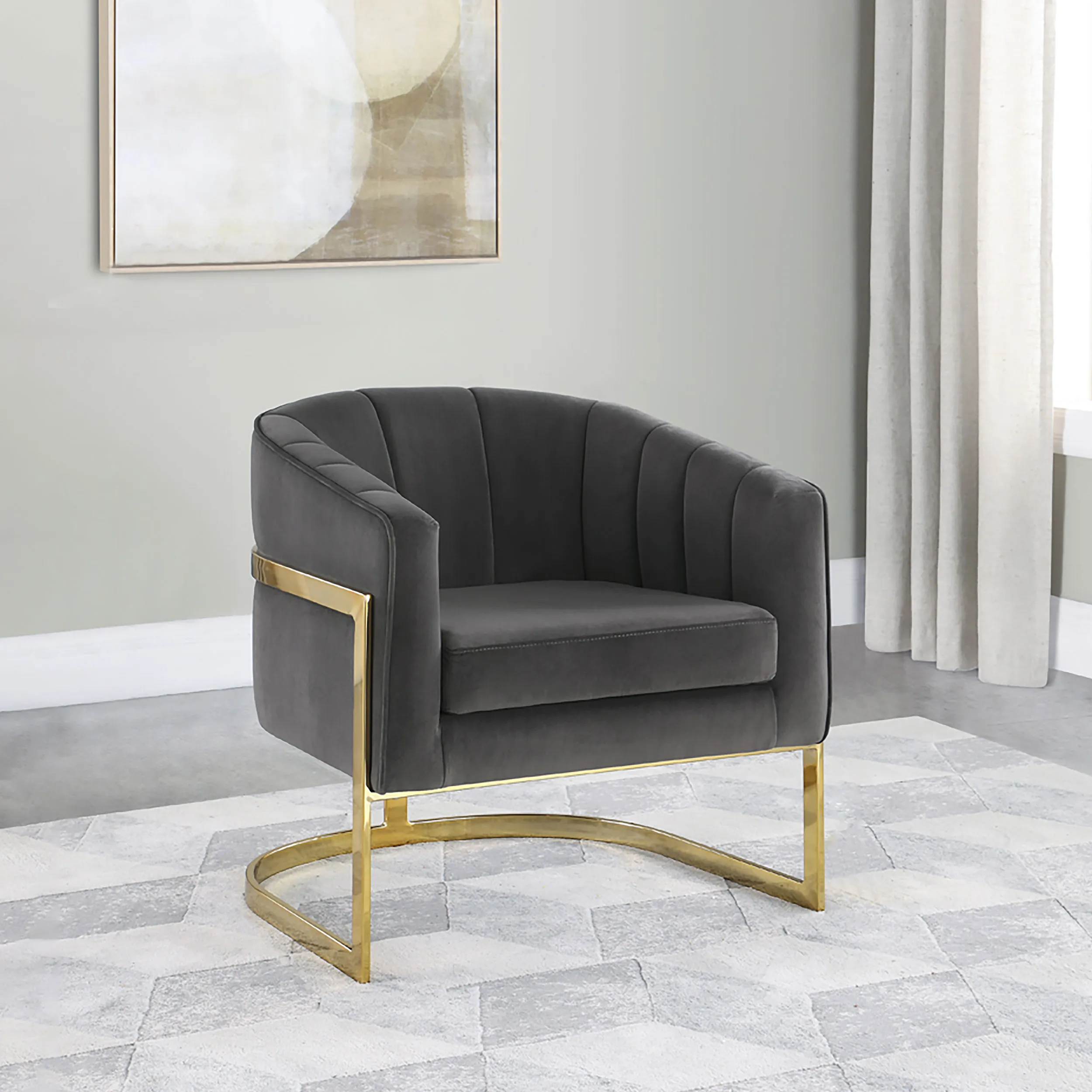 Exquisitely modern and stylish, this bucket chair provides comfort and aesthetic allure. It’s upholstered with soft velvet that will have you sinking into the padded cushioning. Vertical tufting adorns the backrest for an eye-catching appearance. The bold gold frame will never go unnoticed, perfectly supporting this piece as you relax. Use this dark grey accent chair in your living room, bedroom, or home office.