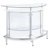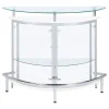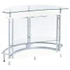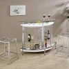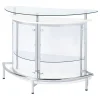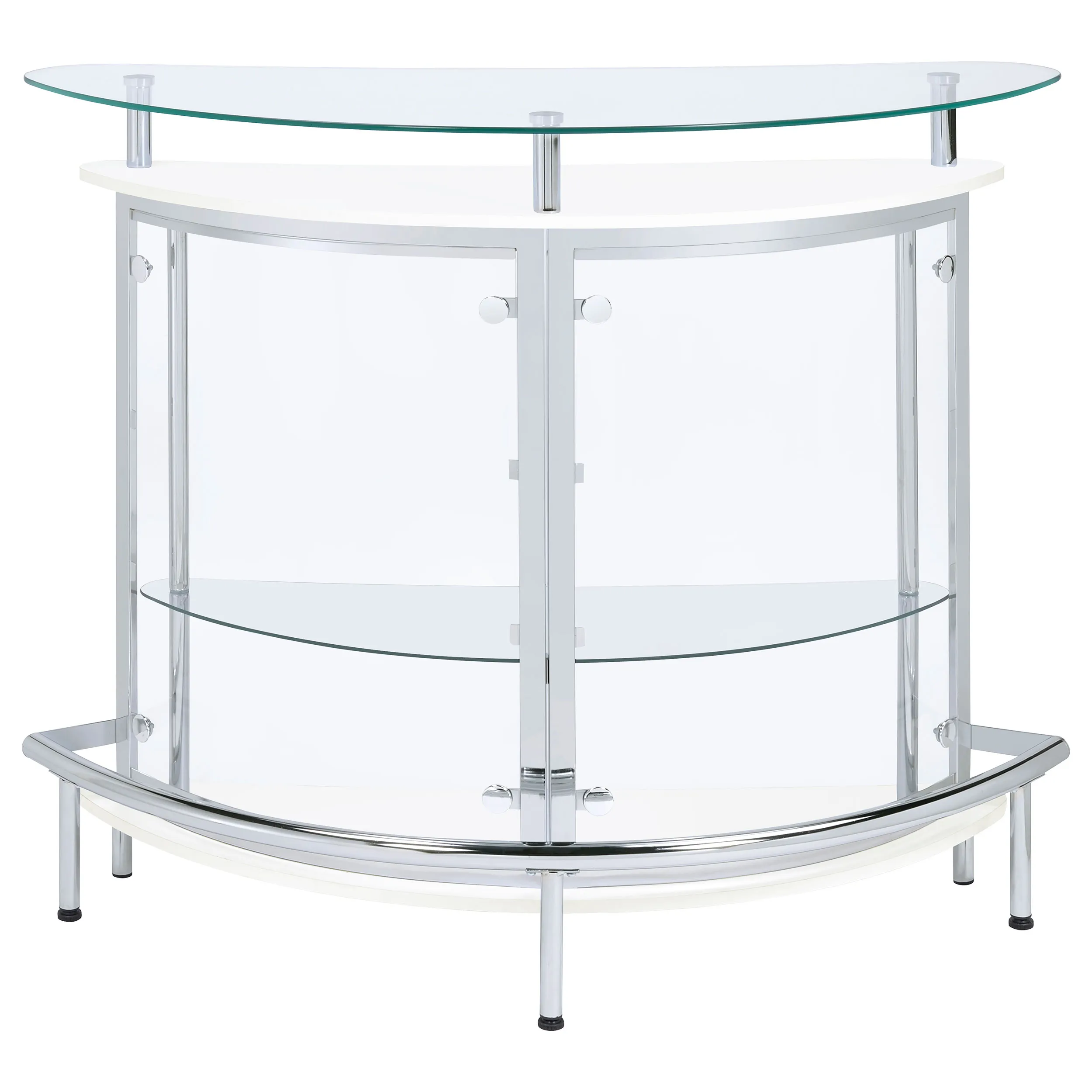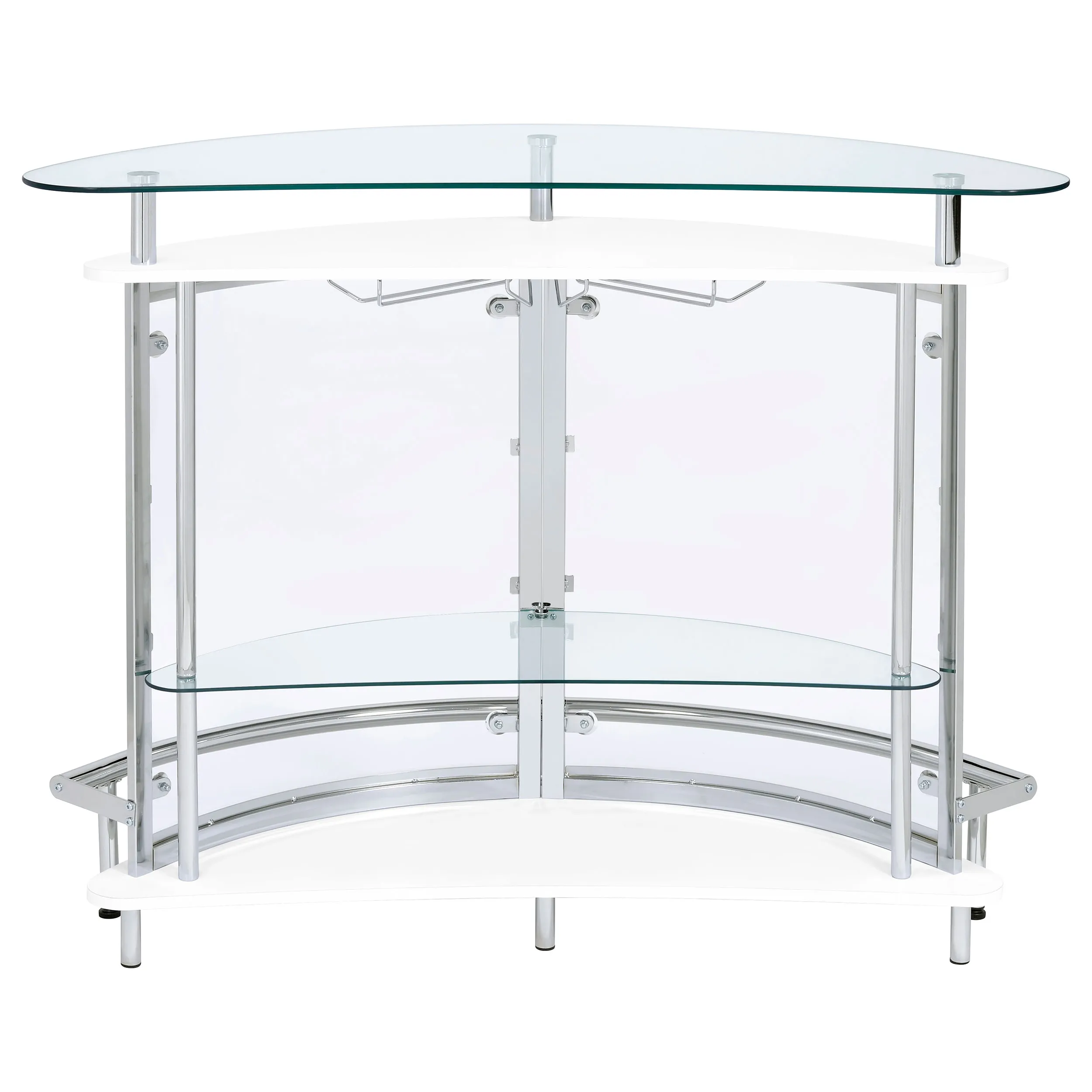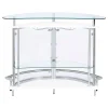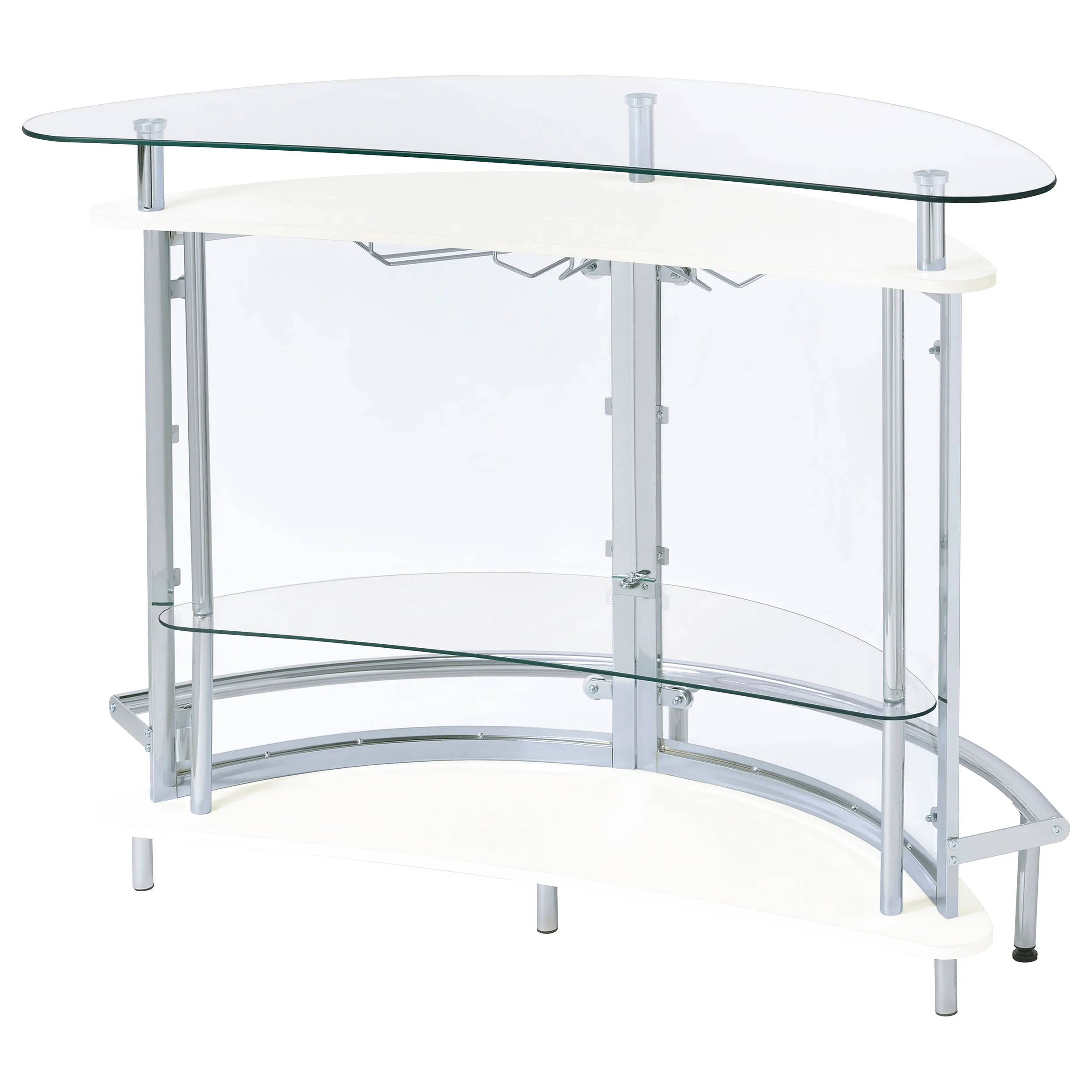 Upgrade your home entertainment options with this gorgeous, contemporary bar unit. With a convenient wine glass rack and ample storage space, it easily accommodates a wide variety of stemware, bar accessories, and cocktail ingredients. Graceful and glamorous, its curved silhouette is beautifully accentuated with gleaming chrome accents. A large, tempered glass top gives you plenty of prep space to mix delicious drinks for your guests. Complete with clear acrylic panels, this stylish unit allows you to show off your collection of fine wines and spirits in style.