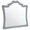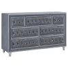 Create an opulent sleeping space with this French provincial bedroom collection, featuring soft and smooth upholstery in ivory and camel trim or grey velvet options. The statement bed boasts a wrap-around shelter headboard and tone-on-tone velvet upholstery with sparkling tufted buttons and crystal hardware. Faux crystal-like accents in the button tufting and gorgeous nailhead trim add to the incredible design. The collection is completed with metallic finished legs with metal cap details. This collection is a Coaster’s exclusive design.
