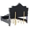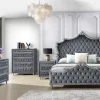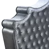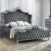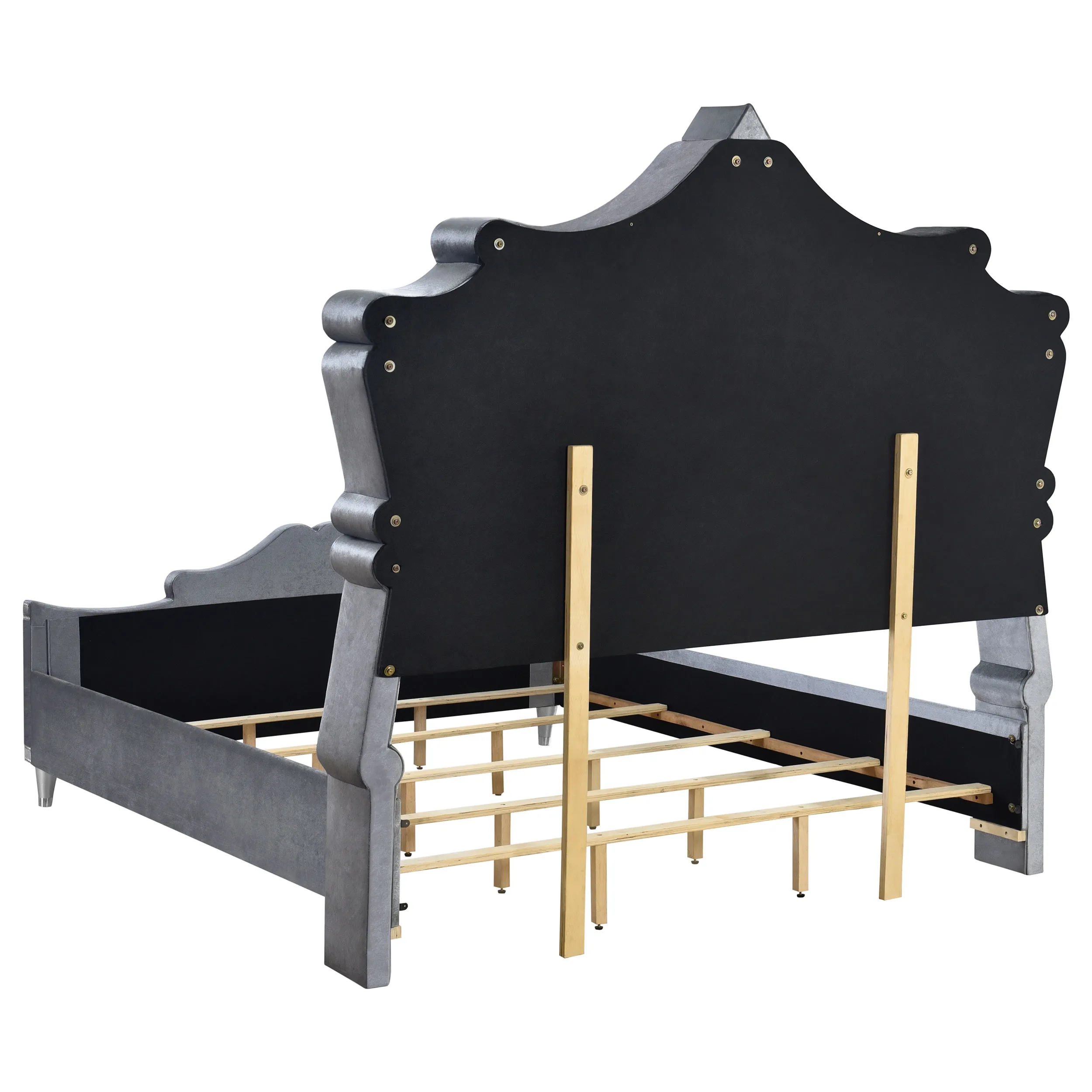 A delicate balance of regal traditionalism and modern sensibilities, this gorgeous glam upholstered bed is an instant centerpiece in any bedroom. Lush gray velvet upholstery graces the shapely head and footboards, each with button tufting that creates engaging texture and dimension. Buttons are made to resemble glittering jewels and accent stitching emphasizes the diamond pattern of the tufting. Embodying decadence, the bed features elegant scrolled accents traced in chrome finish nailhead trim. On the headboard, the scroll trim creates a sheltered effect that delivers a cozy ambiance without sacrificing glamour.