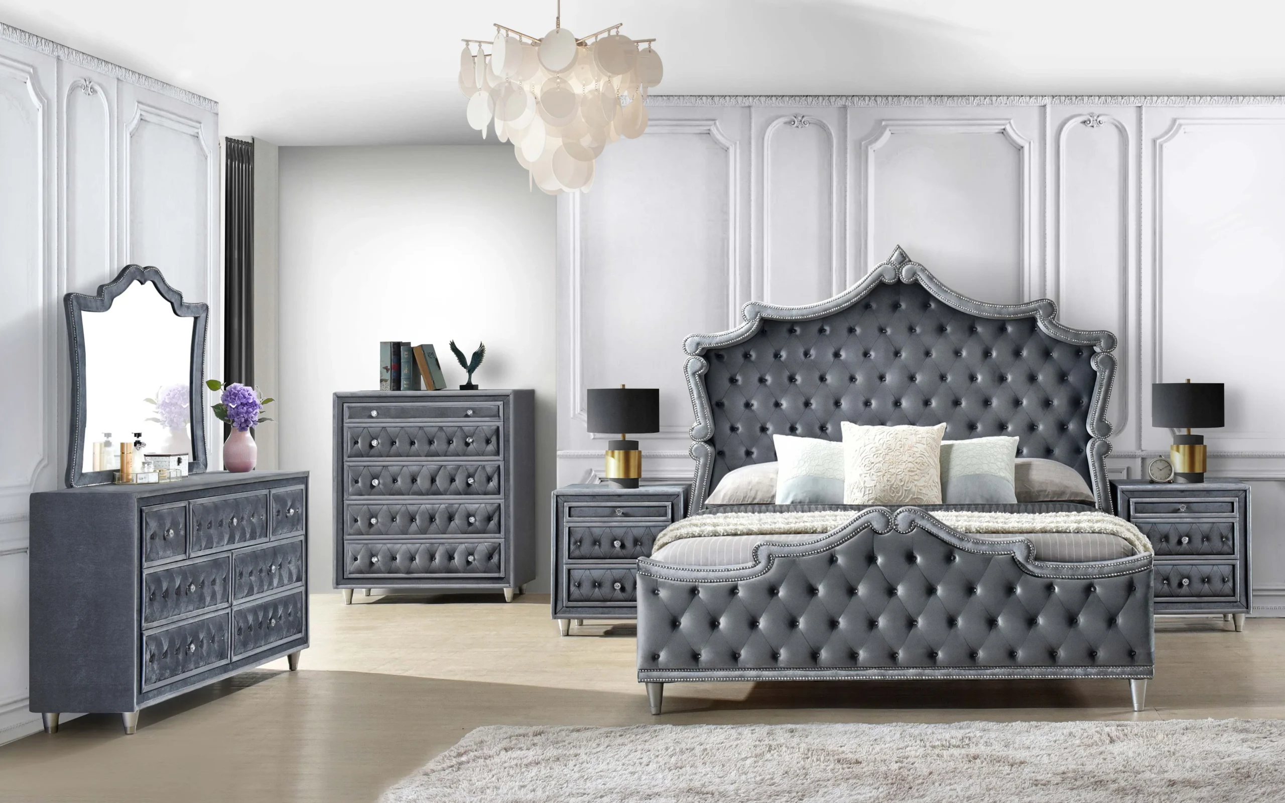 A delicate balance of regal traditionalism and modern sensibilities, this gorgeous glam upholstered bed is an instant centerpiece in any bedroom. Lush gray velvet upholstery graces the shapely head and footboards, each with button tufting that creates engaging texture and dimension. Buttons are made to resemble glittering jewels and accent stitching emphasizes the diamond pattern of the tufting. Embodying decadence, the bed features elegant scrolled accents traced in chrome finish nailhead trim. On the headboard, the scroll trim creates a sheltered effect that delivers a cozy ambiance without sacrificing glamour.