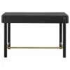 Complete your bedroom or living area with a multi-functional modern coastal vanity desk with a hint of glam personality. Its soft black finish is rich, but neutral, complementing in virtually any setting and showcasing wood grain details. Two drawers create plenty of space, perfect for stashing cosmetics and accessories or desk supplies. Gold finished ball knobs accentuate the drawer fronts, while front legs extend across the desk’s apron to create a sense of depth and dimension. Add a mirror to turn this table into a spot for hair and makeup, or bring your laptop and work from home.