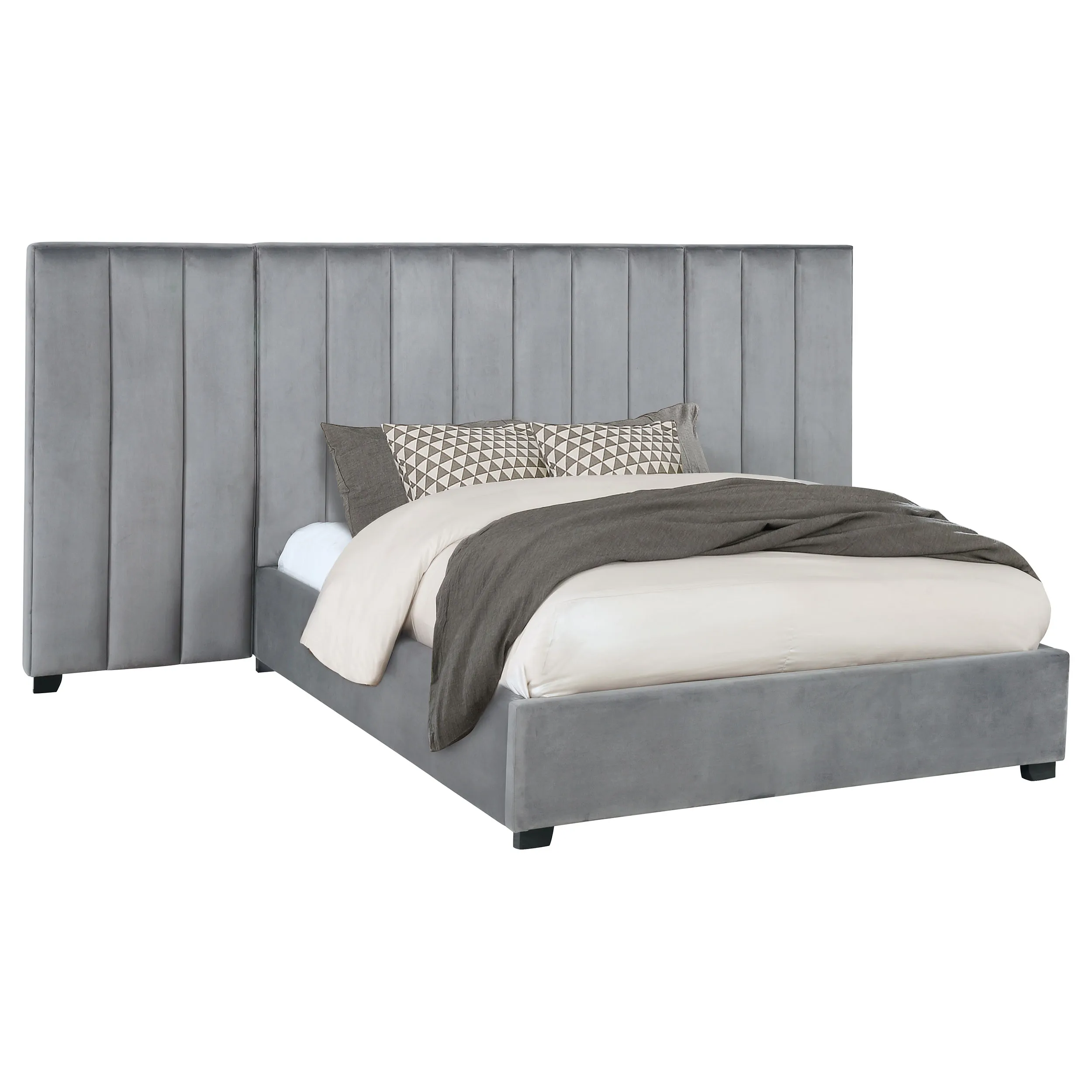 Contemporary and edgy style takes on a plush quality with upholstery fit for a comfy master or guest suite as this modern bed with side panels anchors a haven for ultimate relaxation. Add dimension and cool color to any bedroom with this platform bed and wrapped in cool gray velvet upholstery and embellished with two wide wall panels that dominate an integral wall. Vertical strips create geometric energy to wall panels backing a simply styled bed covered in gray velvet and sitting on petite black finish feet. A versatile yet timely palette invites surrounding case pieces tailored to personal taste. Set includes one bed and two wall panels.