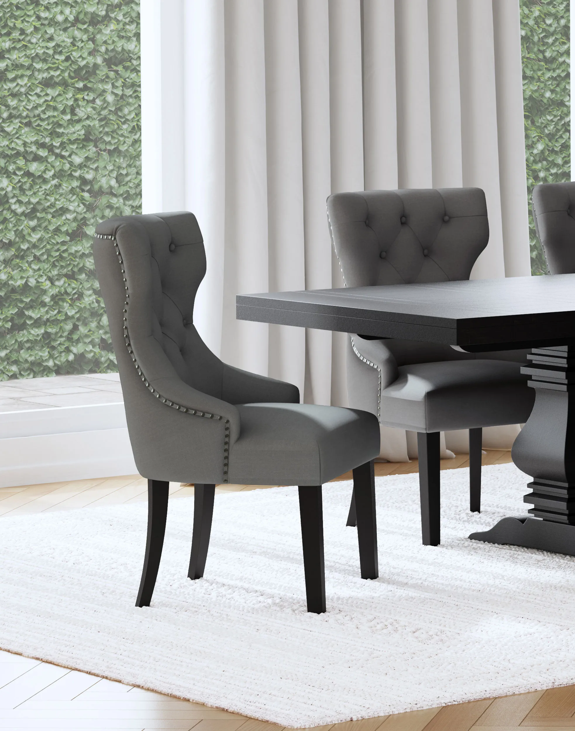 Create an exceptional, inviting dining room space with a modern button tufted dining chair. It pairs a classic wingback profile with a gentle curvature, offering impeccable comfort and chic style. Its plush back and seat feature foam cushioning with soft upholstery, delivering indulgent seating experiences to all who dine at your table. The back of the chair includes nailhead trim that adds a dimensional finishing touch. Black finish legs complete the look with austerity and excellent support.
