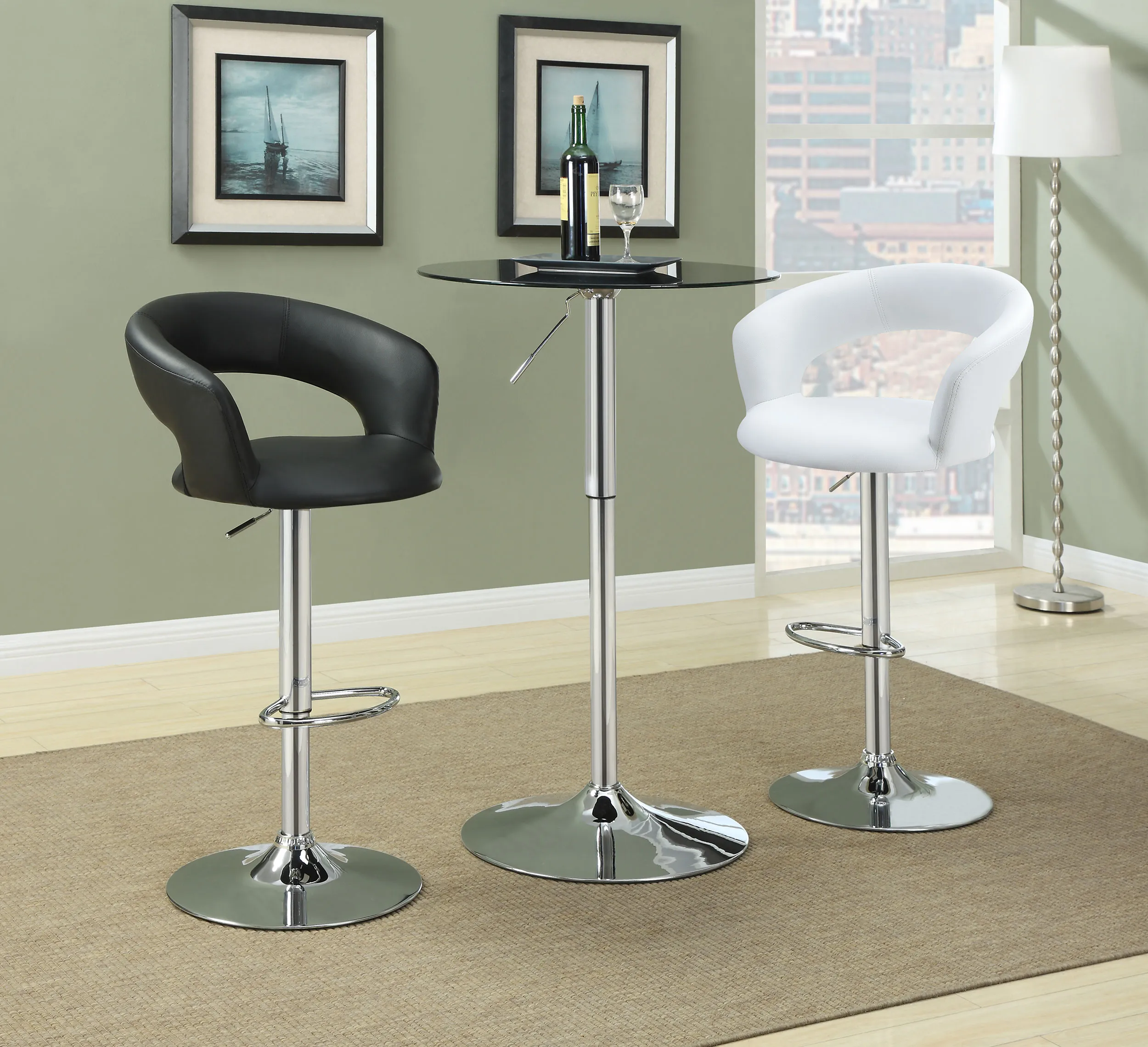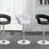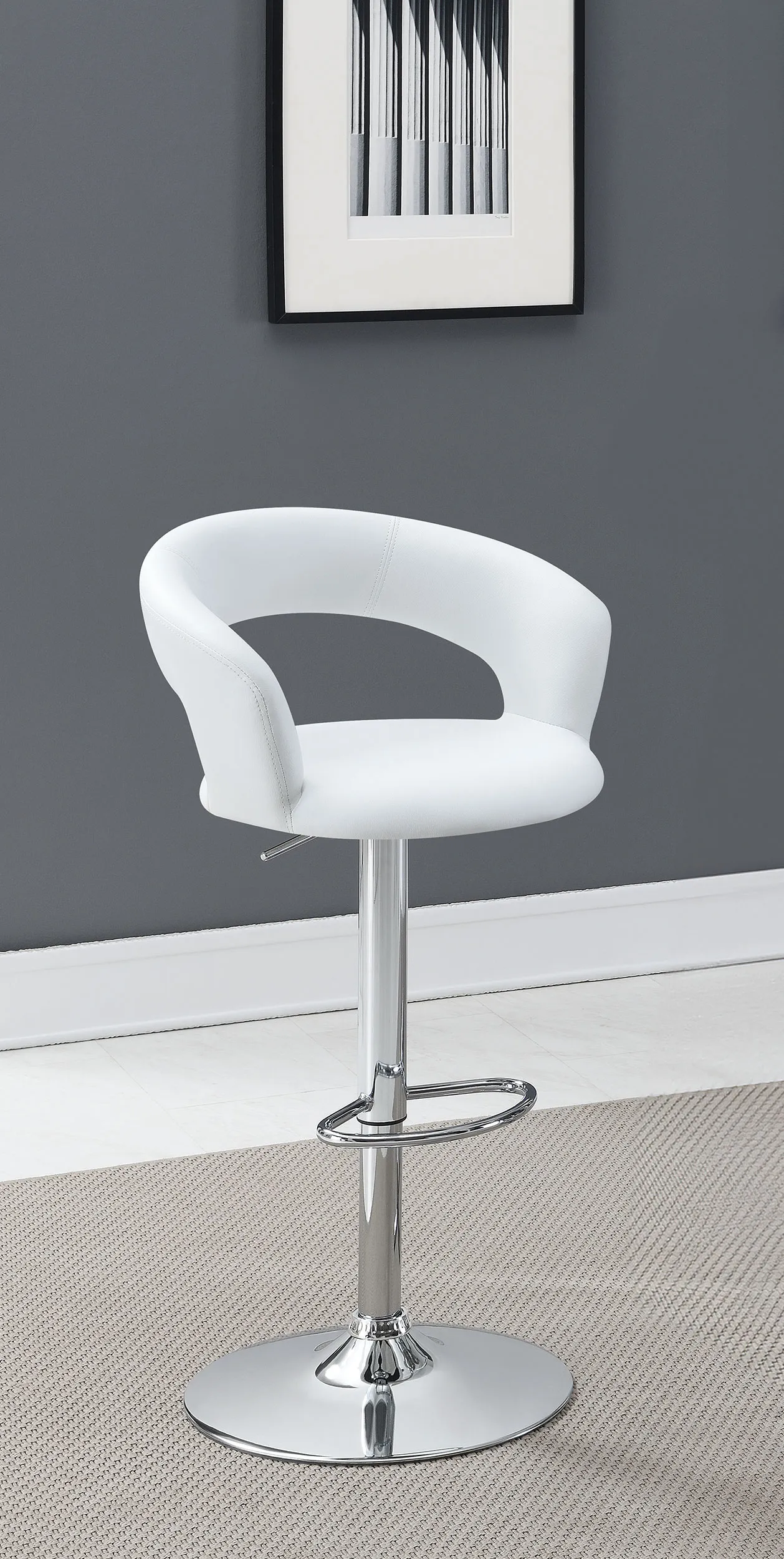 Sleek, elegant, and modern, this barstool is a fashionable choice. With comfortable seating and convenient height adjustability, it’s also exceptionally versatile. Its frame is constructed from high-quality steel for plenty of stable support. Its seat is upholstered in smooth leatherette with a thoroughly appealing texture. A classic, chrome base rounds out its design with pleasing polish and dazzling shine.