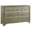 Add a touch of bling to your bedroom. Decorated with dazzling, mirror-like embellishments, this dresser has a truly glamorous look. A shimmering champagne finish adds a gorgeous touch of sparkle. Sleek, silvery drawer handles give it even more brilliant shine. This exquisite dresser pulls a room together in fabulous harmony.