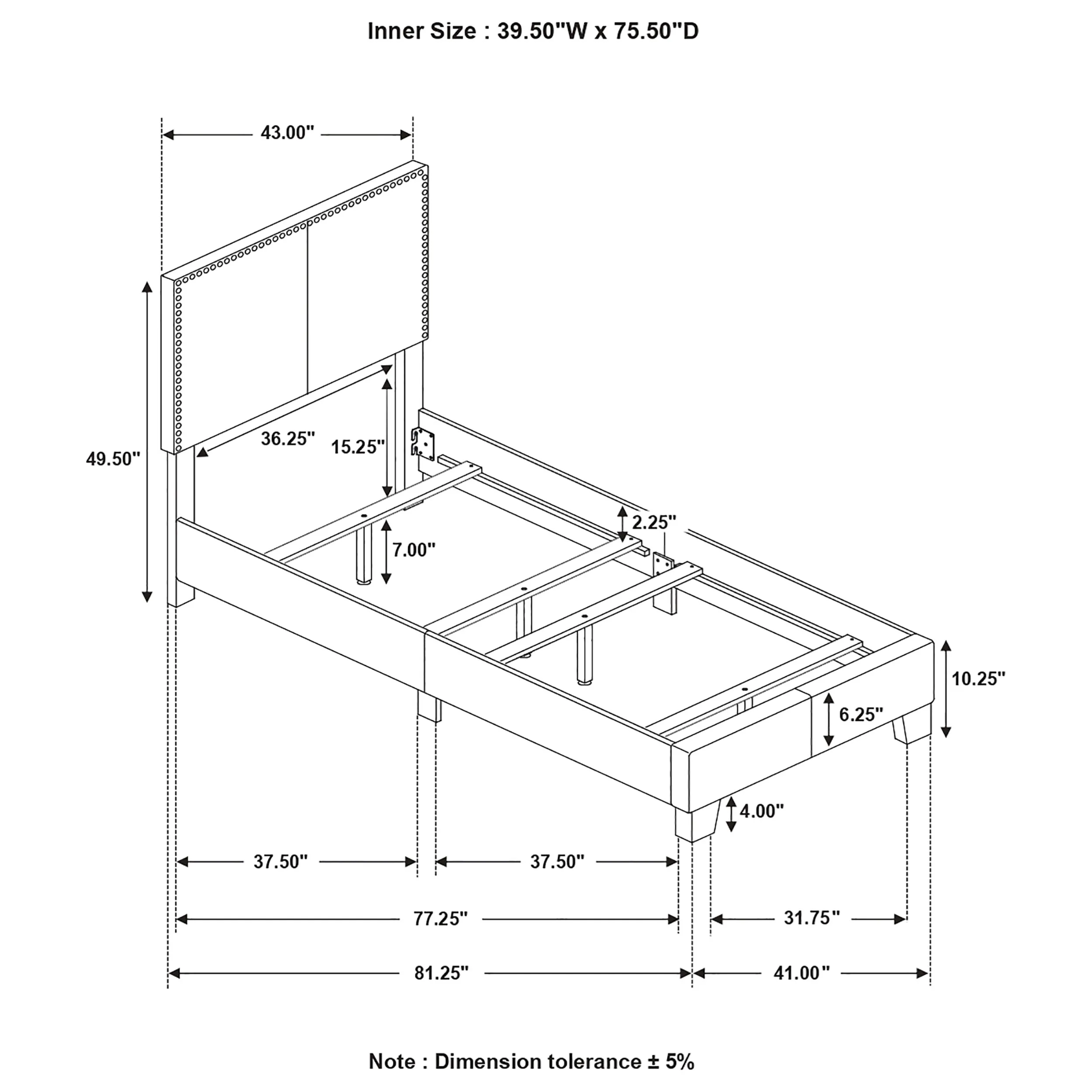 Embrace a relaxed modern style with the smooth edges from this upholstered bed frame. Complete with solid wood legs in black finish, the open frame warms up spaces with simplicity. Chic and individually placed, the chrome nailhead trim adds pops of metallic radiance along the fabric-covered headboard. Constructed of smooth rectangles, the open silhouette feels calm and welcoming. Neutral and soft hues ensure that traditional and contemporary design schemes are maintained.