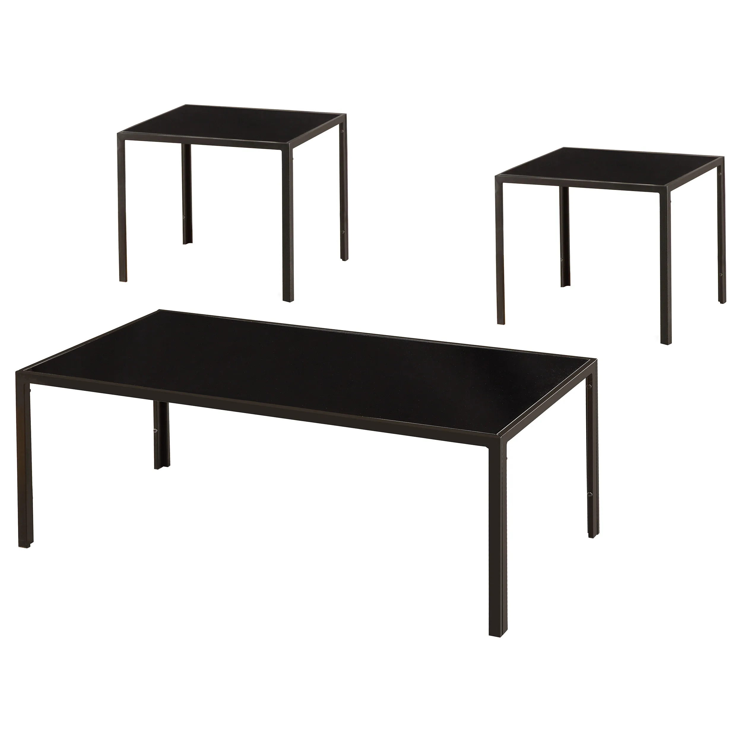 Slender and sensual, the design of this three-piece occasional table set tells a story. With a minimalist presence, it still offers a design-forward impact. Contemporary and inviting, its antique pewter finish adds a nice surprise. Glass top surfaces with sleek black finishes create a dynamic, dramatic effect. Set includes a coffee table and two matching end tables.