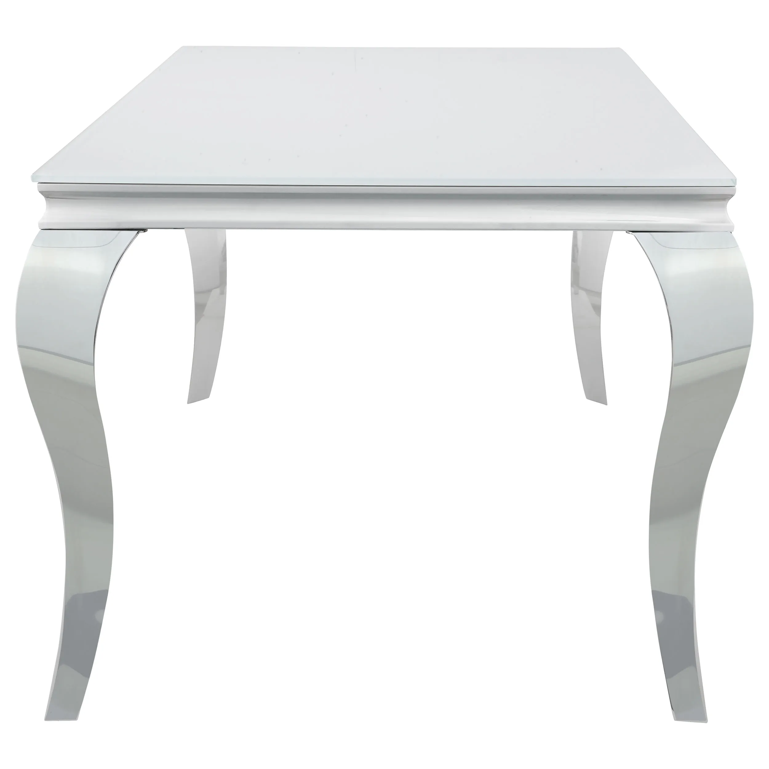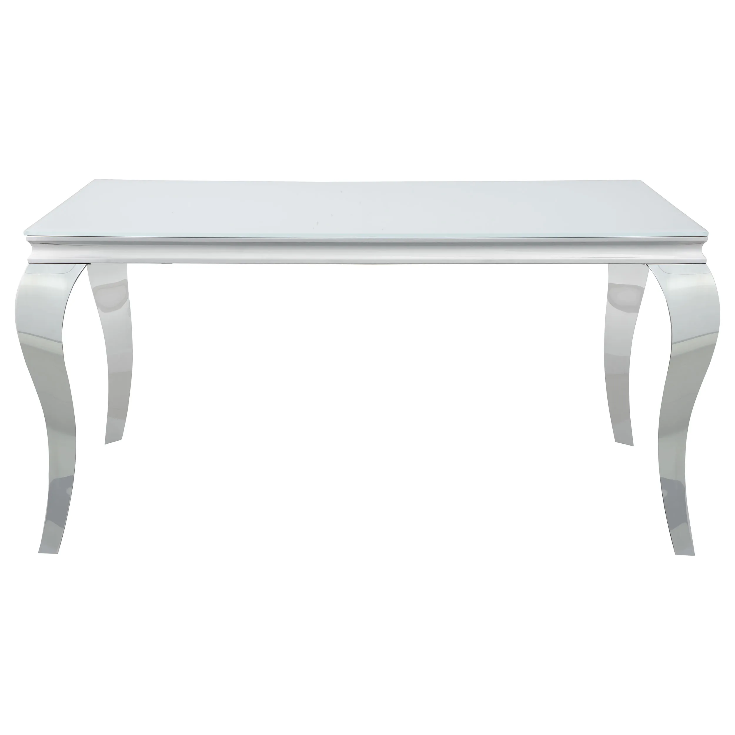 Elegant with a touch of glamorous, this dining table adds a wonderful statement piece to a more formal dining room. Made with mixed materials of durable stainless steel and glass, this dining table features lends itself to a variety of color palettes. A polished and gleaming chrome finish on the table base, complete with classic Cabriole legs, lend a traditional flair to a contemporary style. Gather around and get your plates on the opaque white tempered glass tabletop. In addition, this dining table seats six people comfortably.