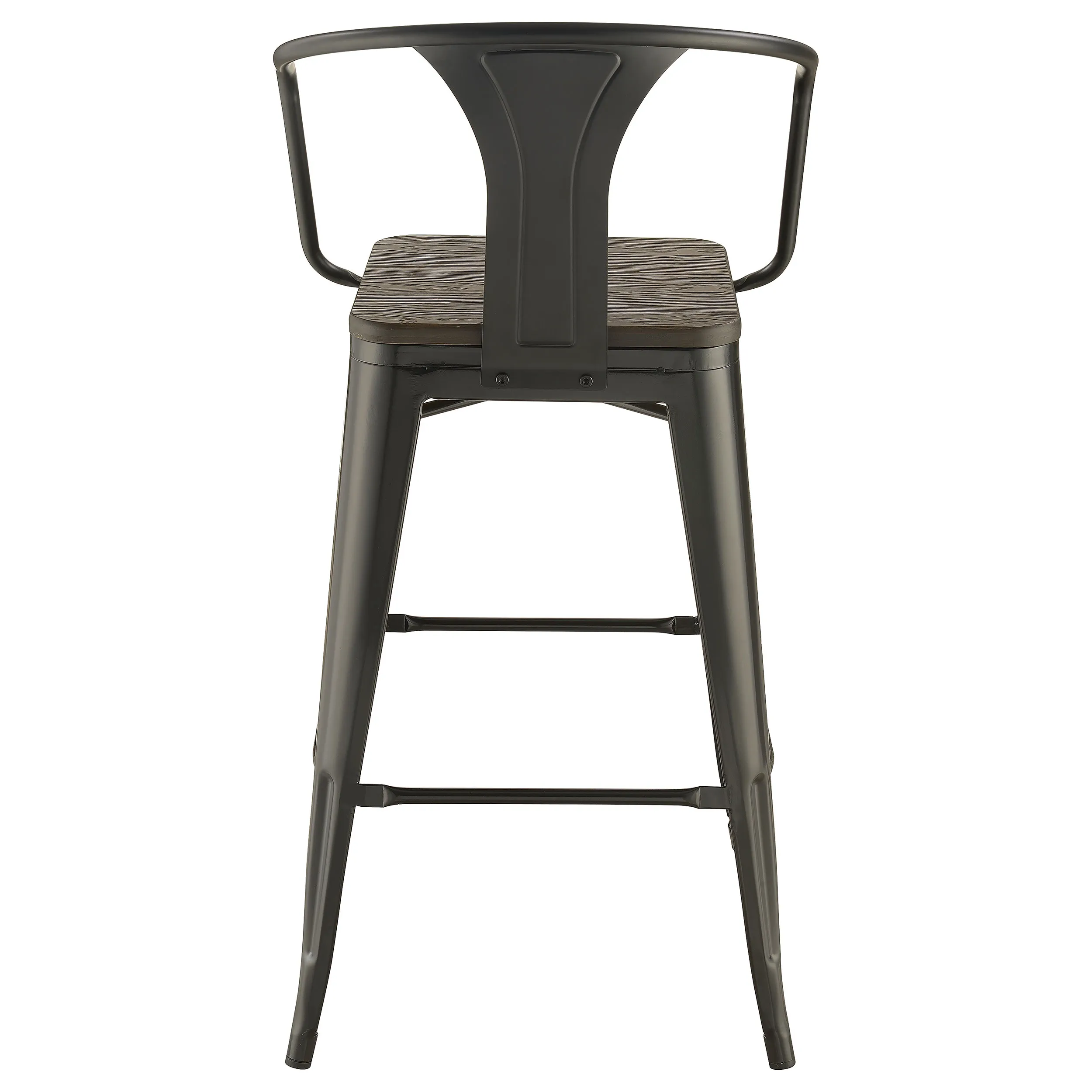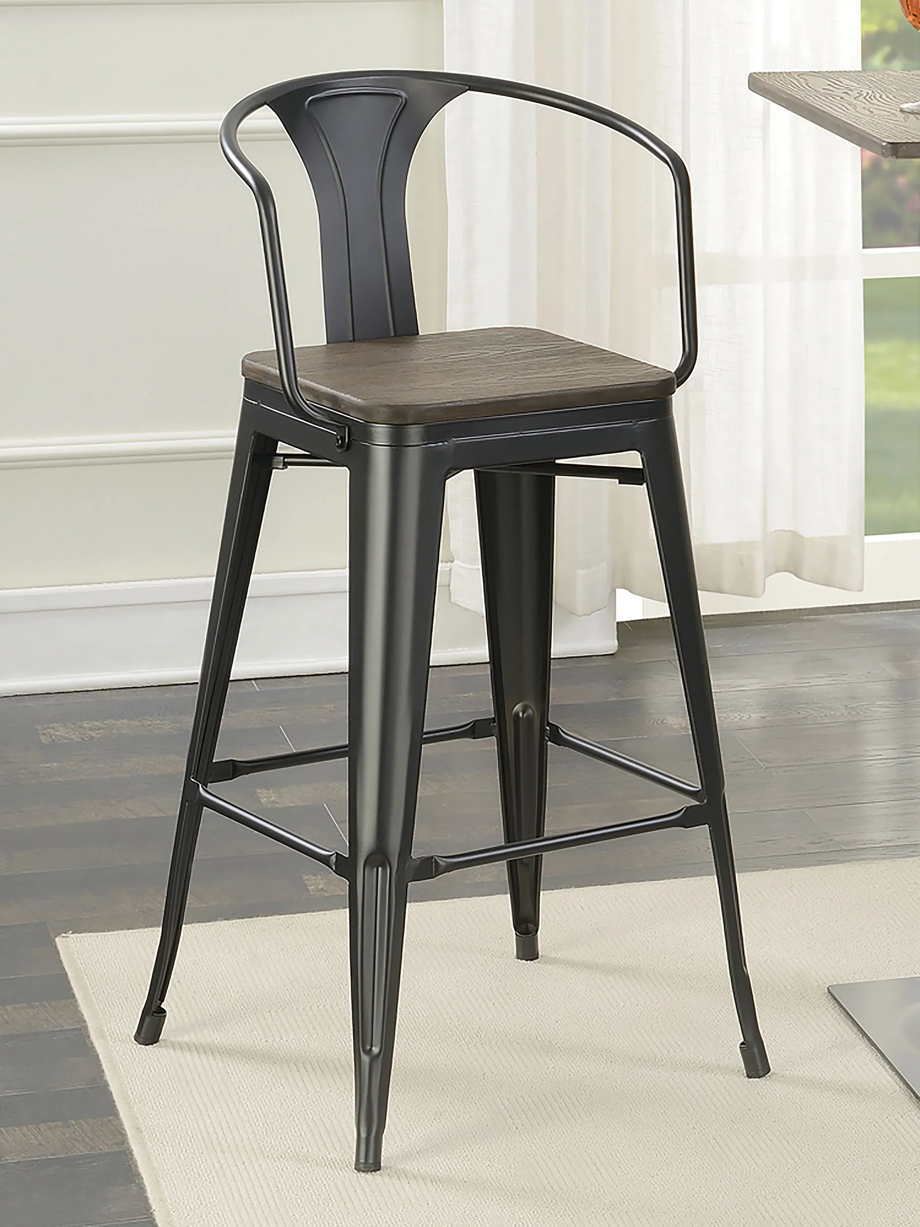 Add a touch of industrial flair to your bar or kitchen area with this Tolix style bar chair, featuring a blend of metal and wood-inspired textures. The chair boasts a sturdy metal frame with a sleek matte black finish, paired with an embossed solid bamboo seat in a dark elm finish. Its curved backrest and integrated armrests provide ergonomic support, allowing for relaxed seating during meals or gatherings. With its minimalist design and durable construction, this chair is perfect for both home and commercial settings. The combination of rustic wood tones and modern metal accents makes it a versatile addition to any decor, offering both comfort and style.