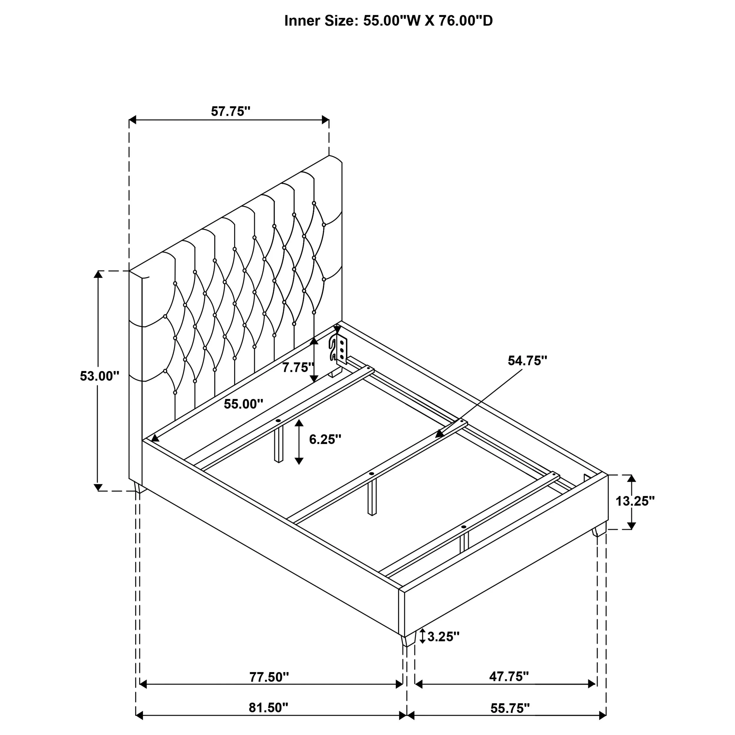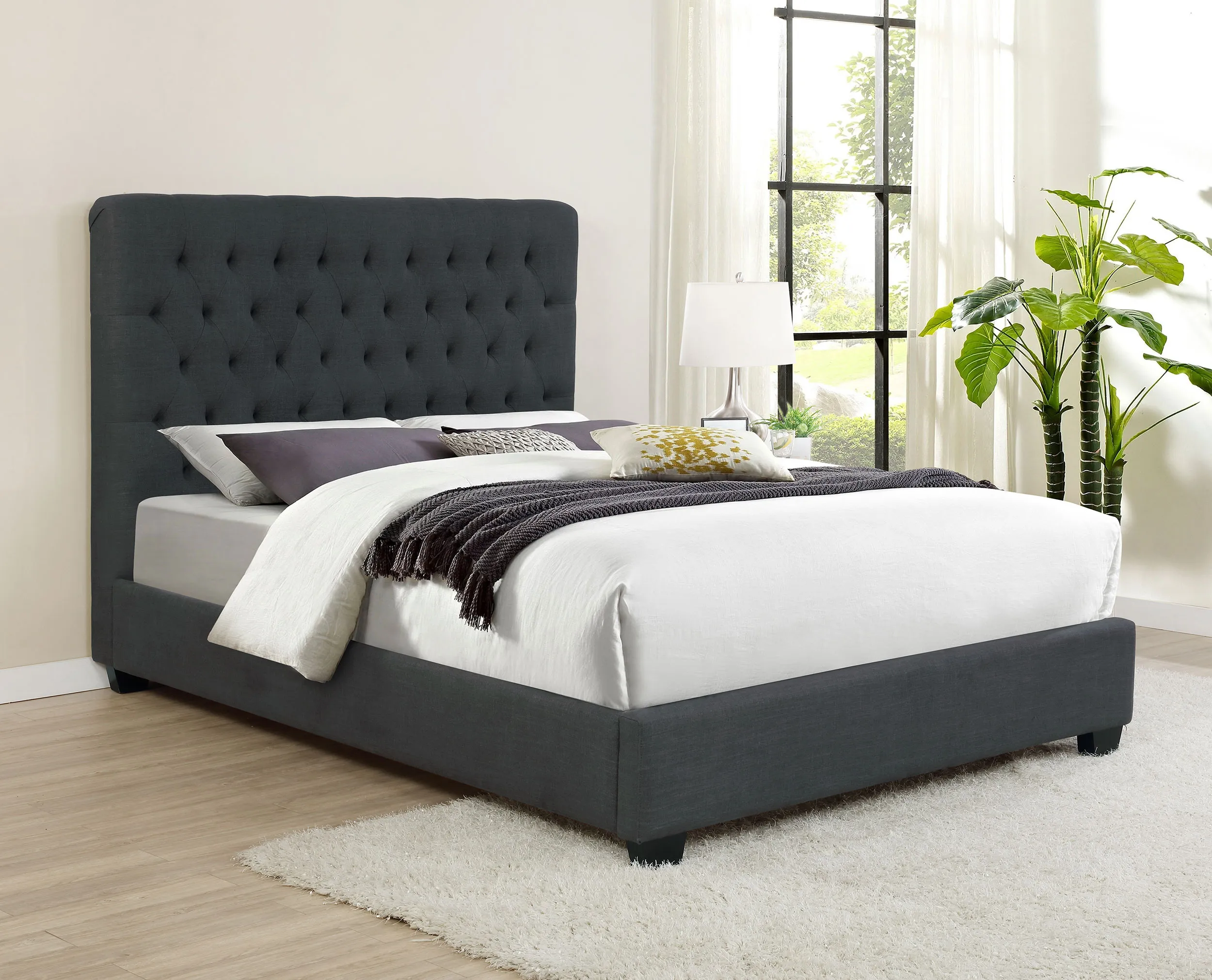This low-slung bed combines elegant styling with a simple design that’s a gorgeous addition to the home. The high headboard has crisp lines and is beautifully accented with button tufting. No footboard gives this bed an open, appealing quality. The bed sit on short espresso legs that are a handsome complement to the bed design. This bed brings an understated timeless design to the bedroom.