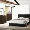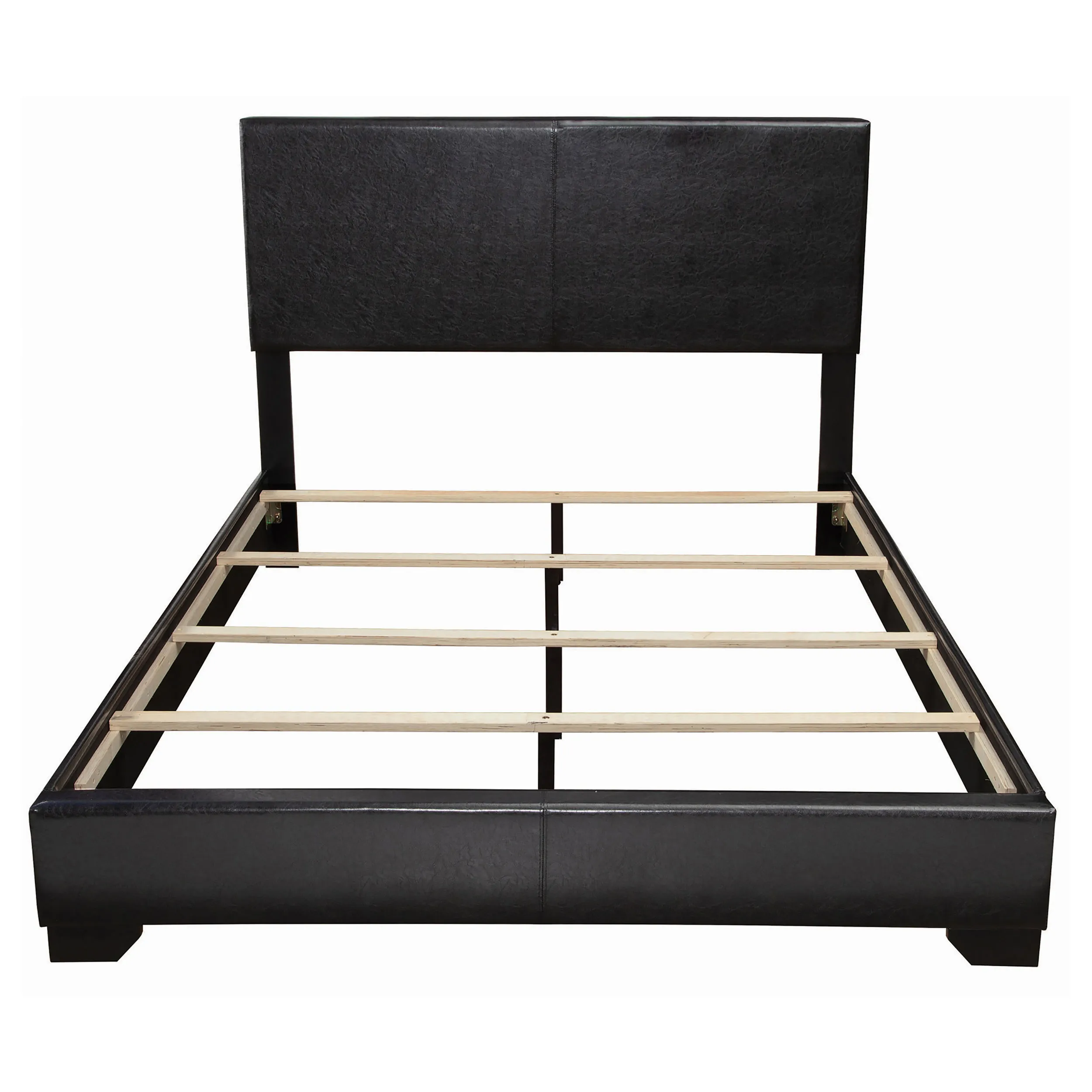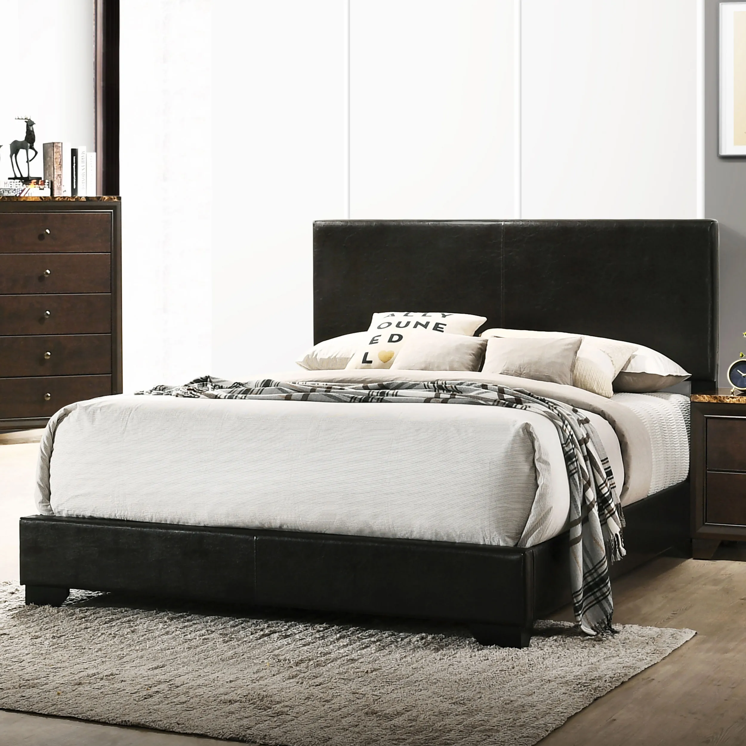 From the Conner collection comes this sleek, contemporary styled bed. It features straight lines and crisp edges for a look that’s smooth and effortless. The bed is expertly upholstered in sumptuous leatherette for a handsome appeal. It features stout solid wood legs for long-lasting durability and styling. This bed imparts a mellow yet classy look to the bedroom.