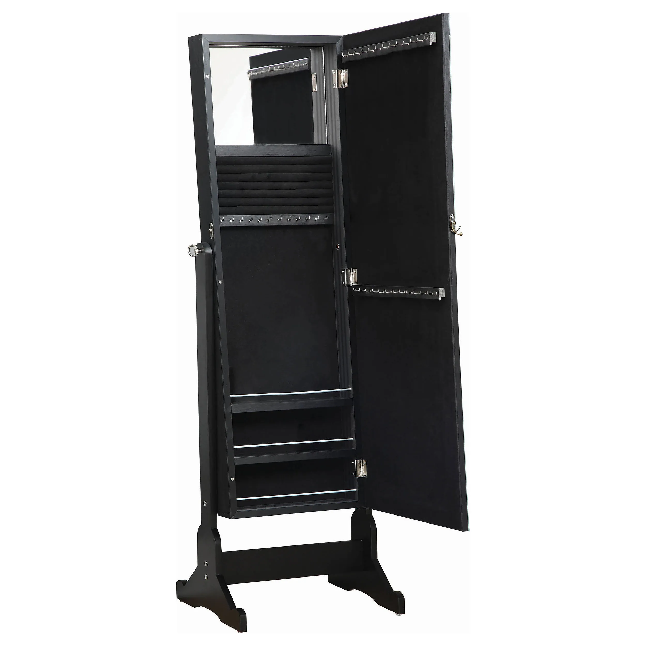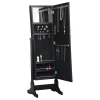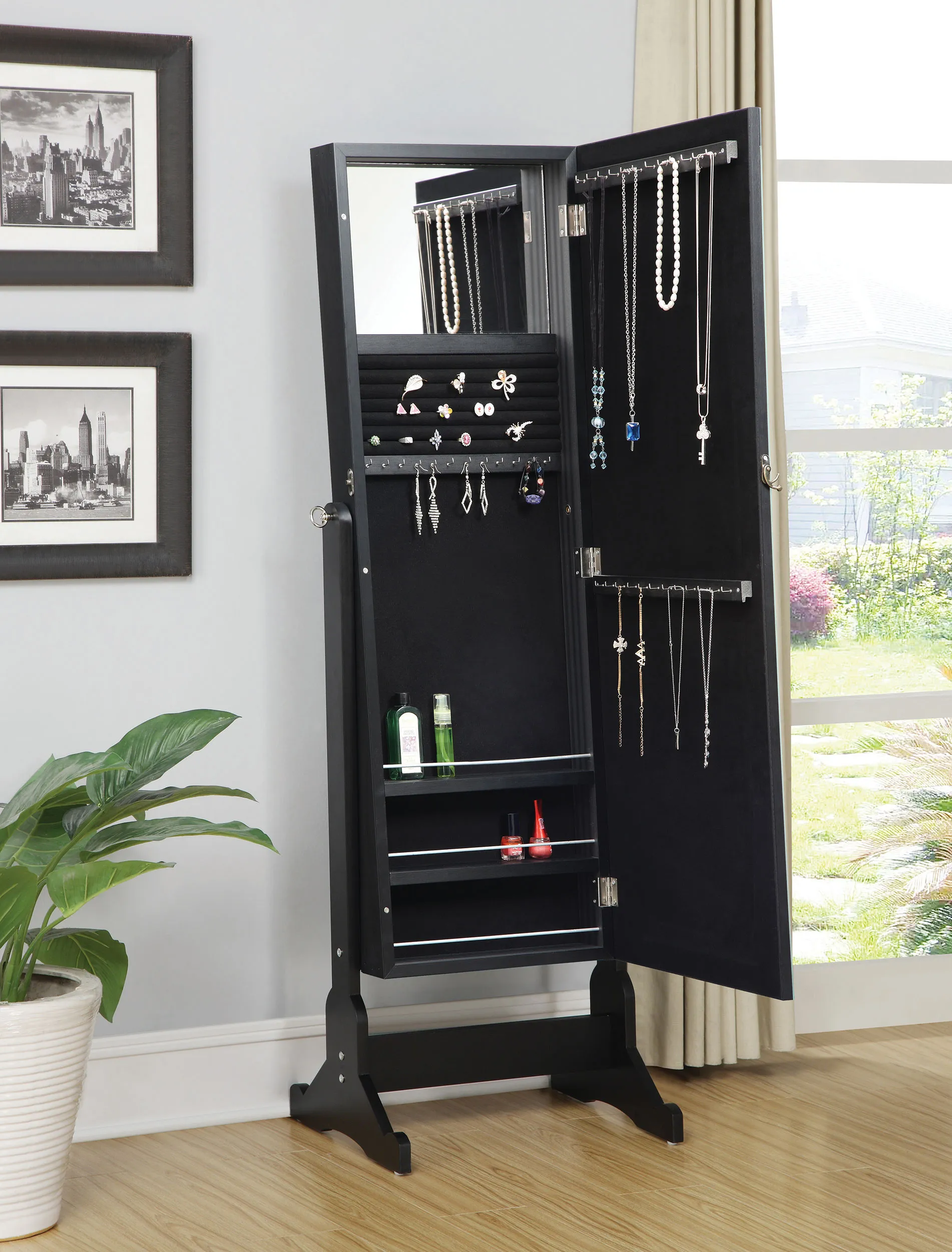 This brilliant multi-function jewelry Cheval mirror serves its purpose(s) in style. It’s almost five feet tall, so it’s got enough reflection to make sure you look great for stepping out. Open it up to three lower horizontal shelves and enough hooks and right holders for all your precious rings and necklaces. A built-in jewelry box that’s four inches deep protects the rest of your precious accessories. Finished in majestic black, it also easily tilts for convenience that’s also stylish.