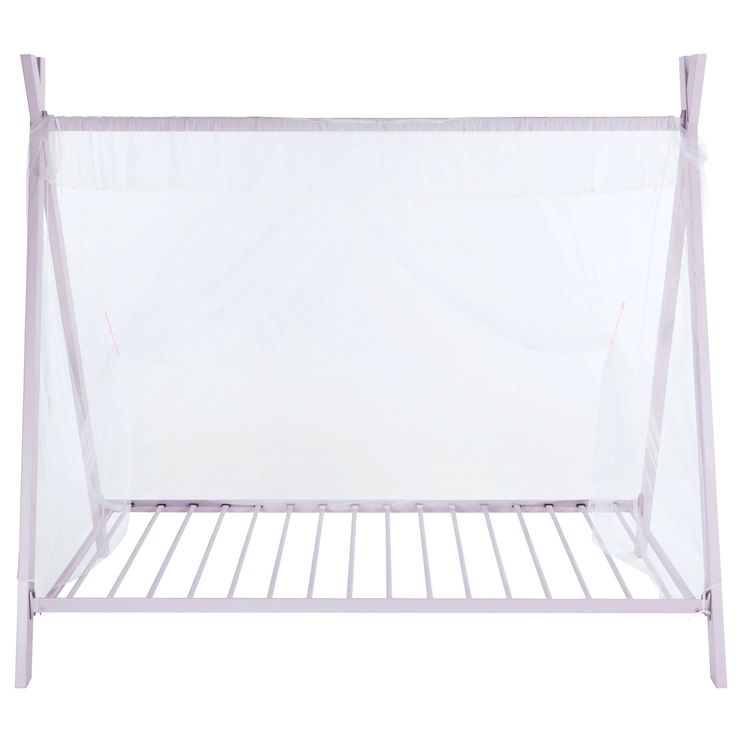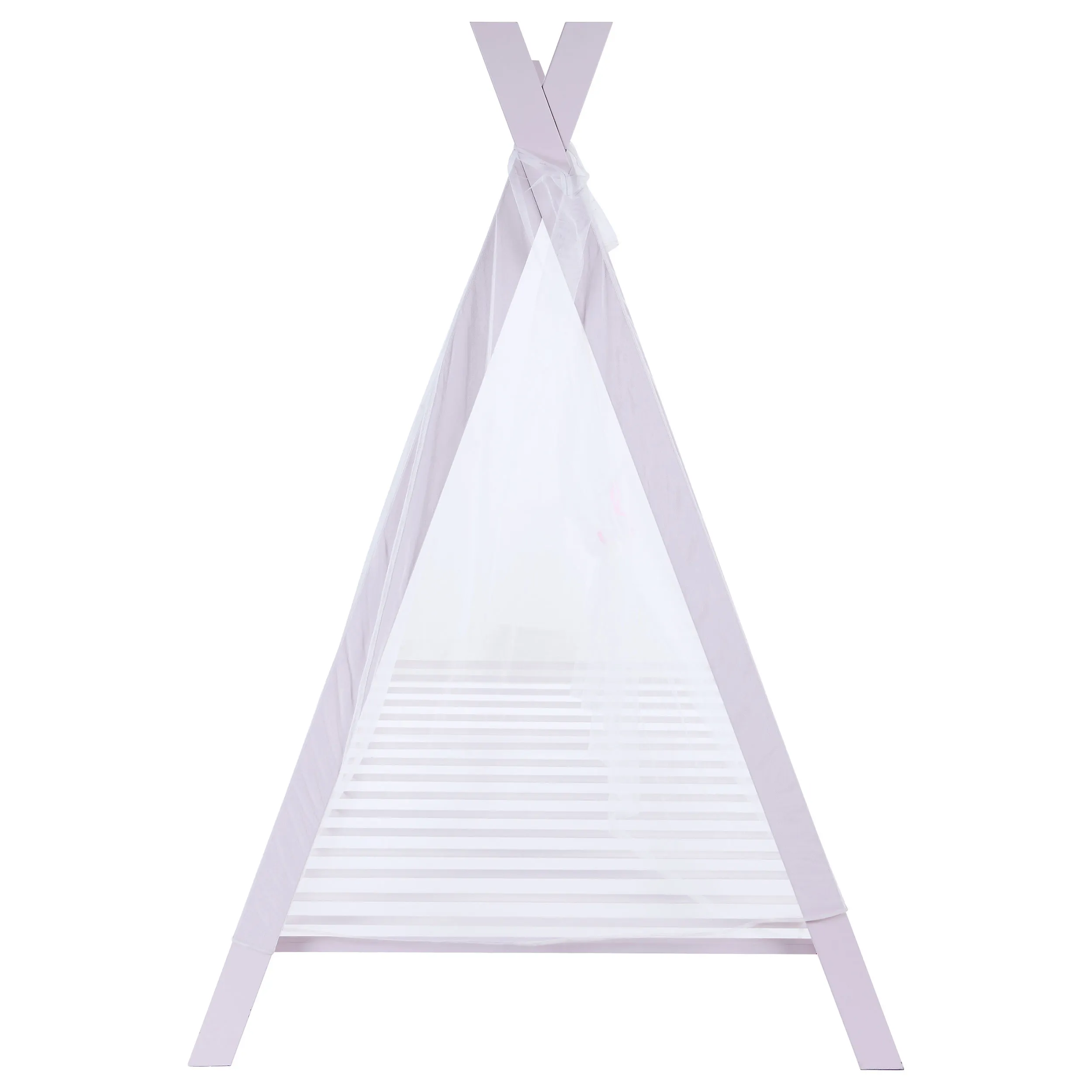 Create a playful aura in a child’s room with this twin tent bed. The silhouette is full of elongated metal lines that crisscross to create a modern tent shape. Complete the charming contemporary style with a crisp pink finish and thin fabric details. Angled legs add depth to the center or corner of a room. Create an up-to-date spin on rustic charm with the soft, bright hues and fun shape.