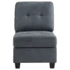 Elevate your living space with this versatile armless chair, perfect as a standalone piece or as an additional seating option in any room. Upholstered in a sophisticated fabric, this chair offers a timeless design that blends seamlessly with various decor styles. The chair features foam-padded seat cushions for superior comfort, supported by a sturdy wood frame that ensures long-lasting durability. Its sleek, armless design allows for flexible placement, making it ideal for smaller spaces or as an accent piece. The subtle tufting on the back cushion adds a touch of elegance, while chunky wood feet complete the classic look.