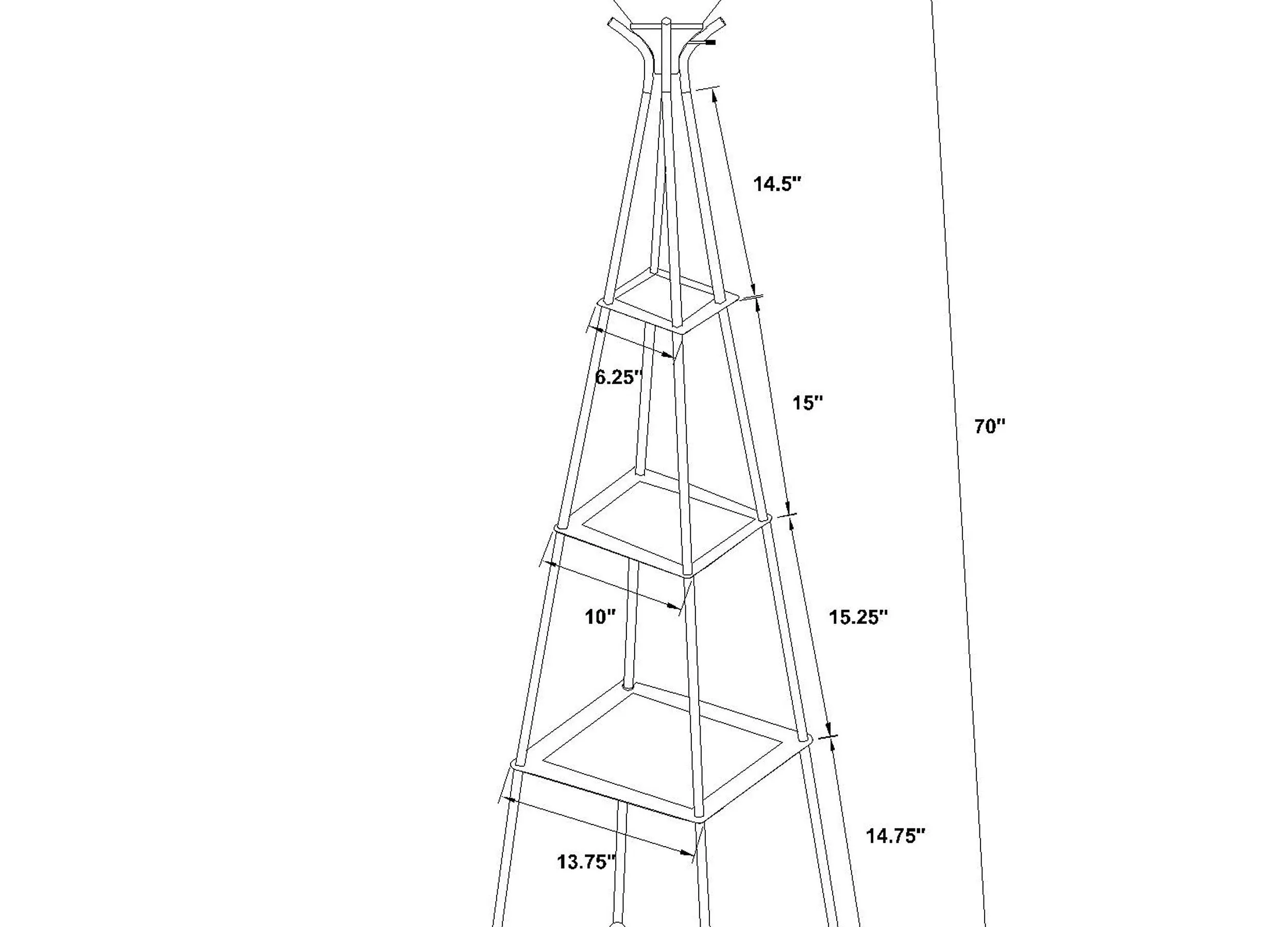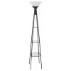 Explore the depths of modern geometric style. With a graceful silhouette, this floor lamp plays up a contemporary theme with a hint of softness. A tapered tower shape body shows off a charcoal black finish, embellished with clear glass shelving at each level. A frosted glass shade and additional down light put finishing touches on this intriguing design. Operates with a three-way switch.