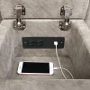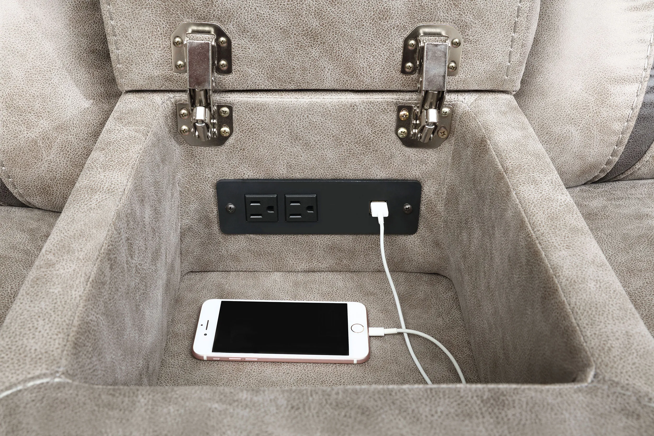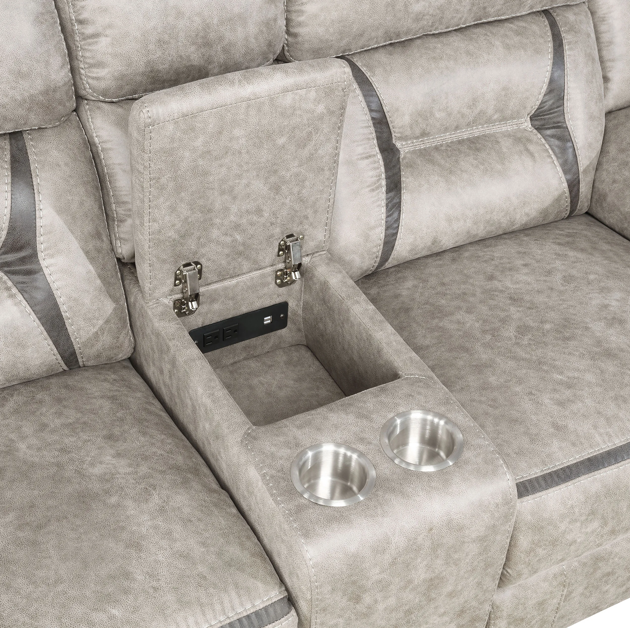 Every entertainment area deserves this glider loveseat with console. The neutral color palette makes it easy to blend with your decor. Its leatherette upholstery ensures a comfortable seating experience. A center console offers a small storage area for remotes with a lift-top container within. Find an easy place to store drinks with the built-in stainless steel cupholders.