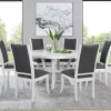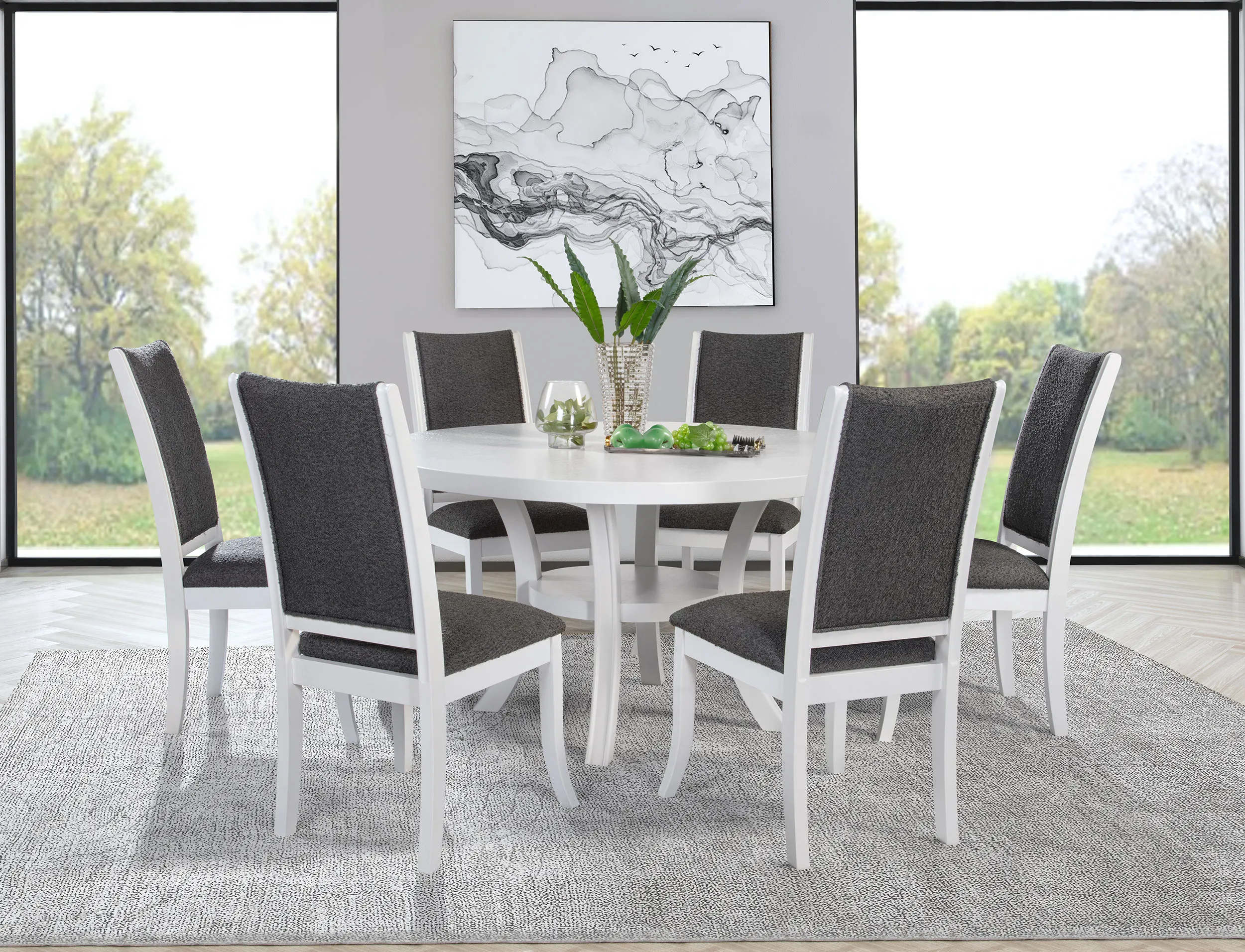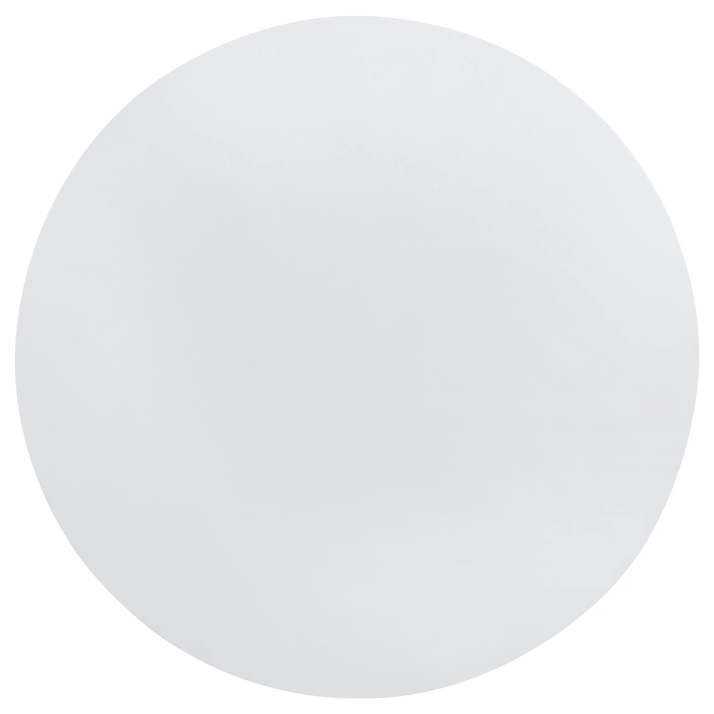 Freshen up your breakfast nook with the clean, modern presentation of a round dining table. It’s a simple, engaging look that features a roomy round tabletop and a cool white finish. The table boasts a square edge and stands on flared legs unified with a single round shelf. The shelf is an easy spot for decor or essentials and creates a cohesive look and feel. Legs feature subtle ribbing that adds texture and dimension.