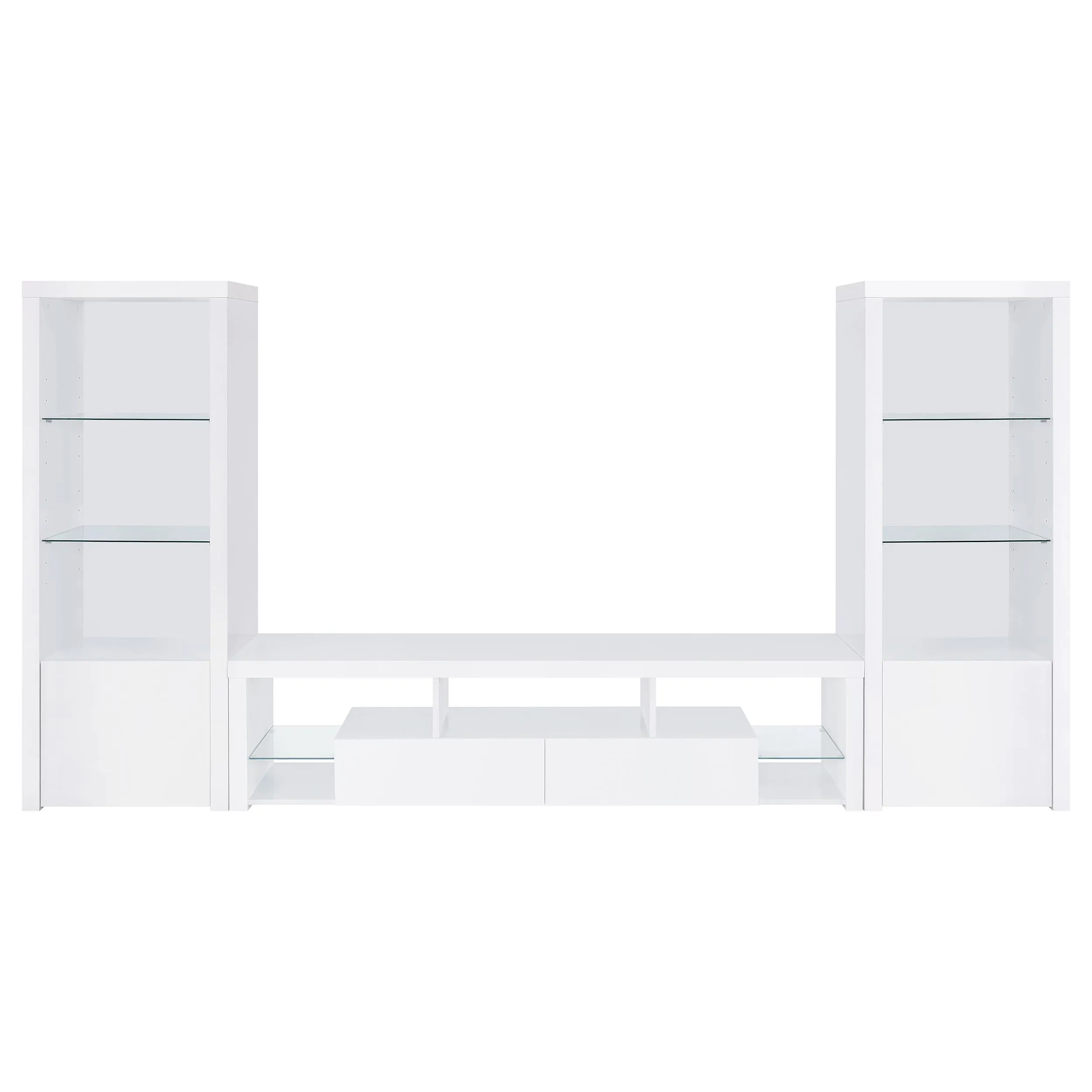 Elevate your entertainment arena with our sleek, modern TV stand. Drenched in a pristine glossy white-on-white finish, it radiates sophistication, accentuated by clear glass details. Its soft-close drawers ensure smooth operation, while glass shelves present a chic display option. Generous storage compartments cater to all your media needs. To enhance the ensemble, the set comes with matching media towers, amplifying storage capacity and offering a unified, stylish appearance. This combo not only meets functional demands but also serves as a captivating focal point in any contemporary space.