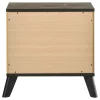 Complete your bedroom ensemble with this stylish nightstand, perfectly blending mid-century modern design with a rustic touch. The weathered brown and natural pine finish, accented by matte black finished metal pull handles, adds sophistication and charm. Featuring English dovetail drawer joinery and center metal drawer glides, this nightstand offers smooth functionality and ample storage space. The 3D paper veneer gives it a textured wood grain feel, making it both durable and visually appealing.