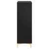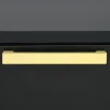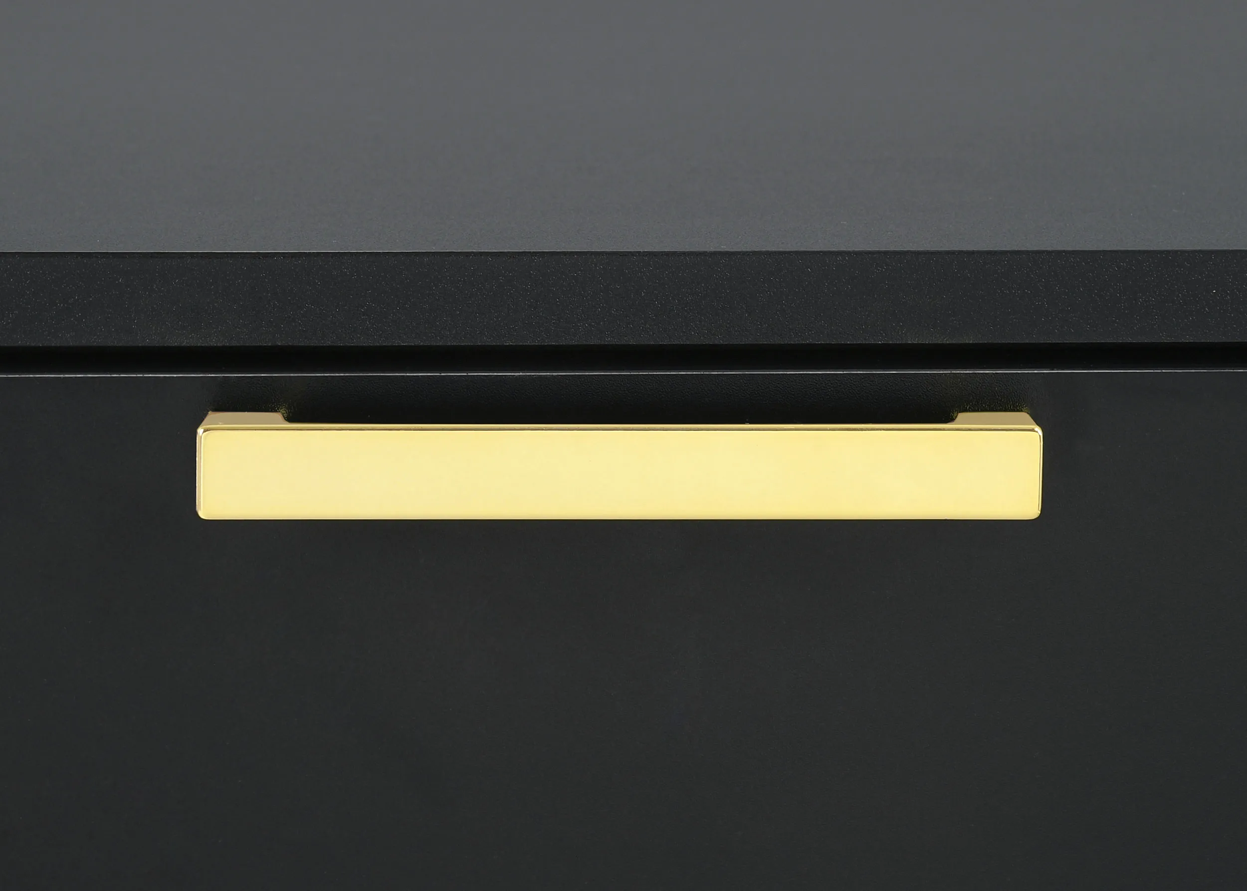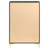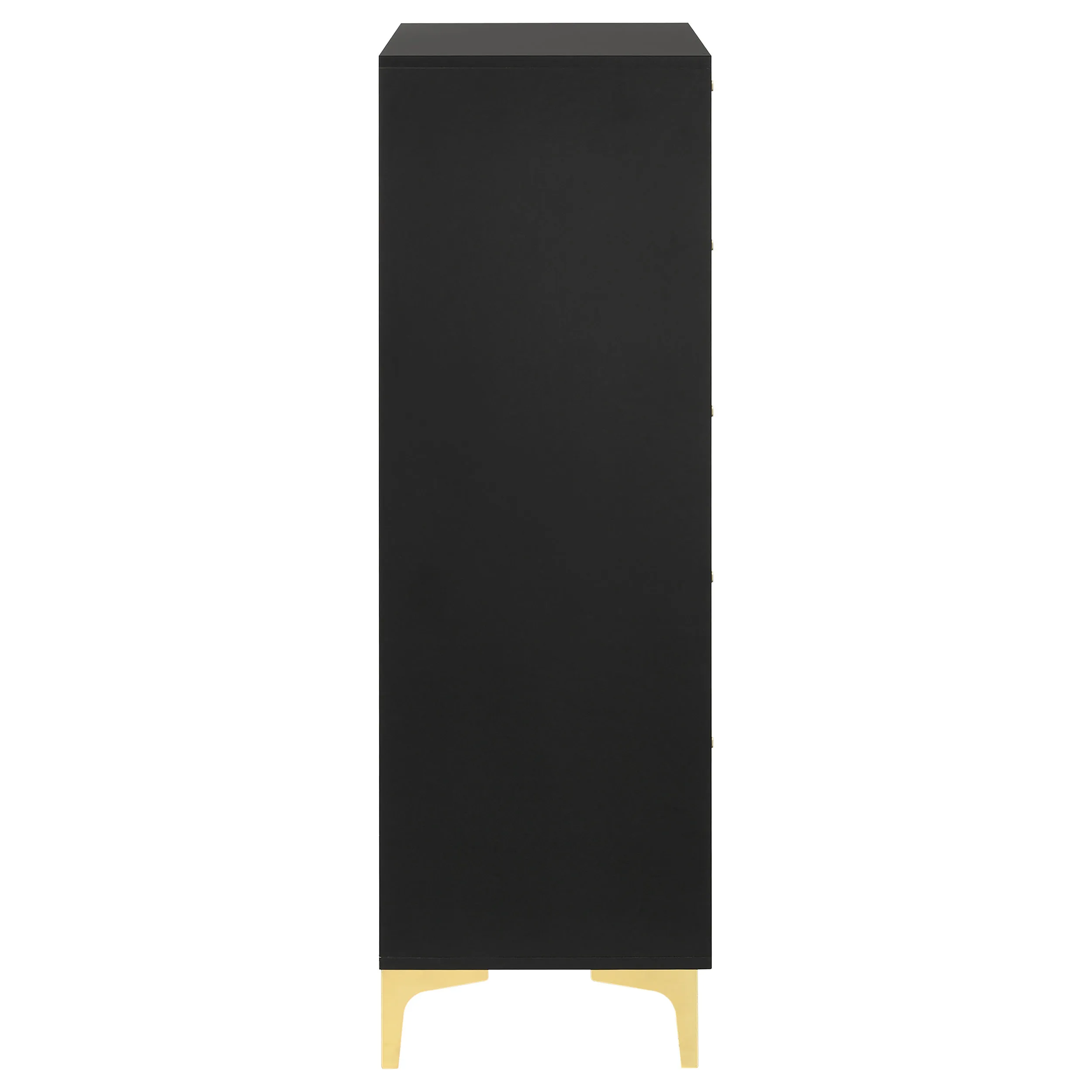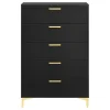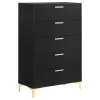 Organize garments, bed linens, and much more in this modern glam chest. Space-saving and tall with a simple, boxy frame, this five-drawer chest keeps your bedroom floor space open and free. A smooth, black finish presents a bold contrast and dramatic flair to focal walls and spaces. Each of the five spacious drawers is fastened with a chic, gold finished pull handle that lends a warm metallic accent. Bracket style legs mirror the golden metallic hues, offering a slight elevation and extra support to this stunning modern five-drawer chest.