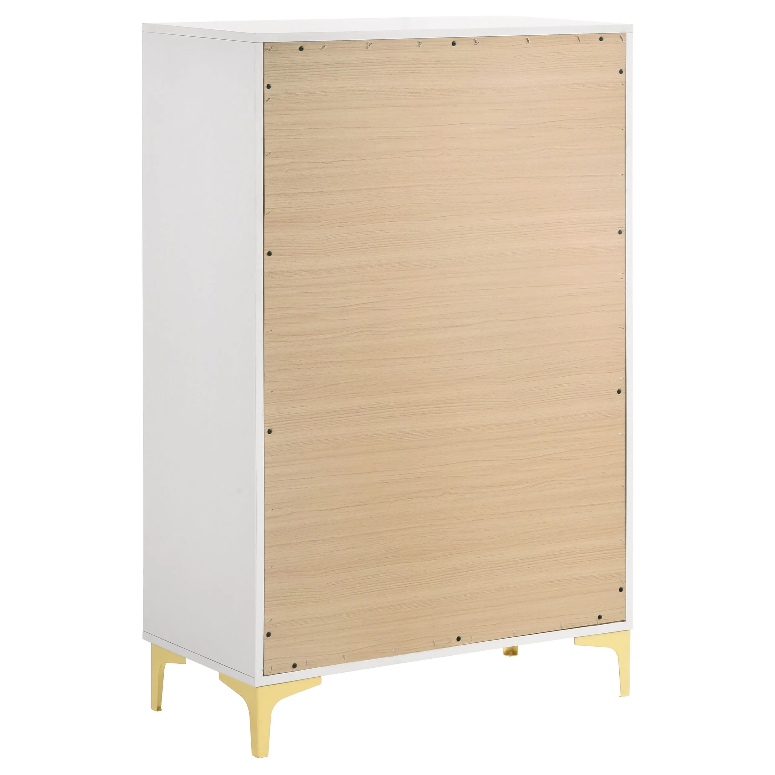 Open up your tight bedroom floor plan with this stately modern glam chest. Five spacious drawers stacked on top of one another keep garments and bedroom essentials stowed away and organized, helping you find what you need fast. A bright, white finish offers a sleek elegance, set off by warm golden accents. Along each of the five drawers is a slender gold finished pull, matched by the golden bracket legs that lift it up. Place this stunning five-drawer chest in your bedroom for an elegantly understated contemporary aesthetic.