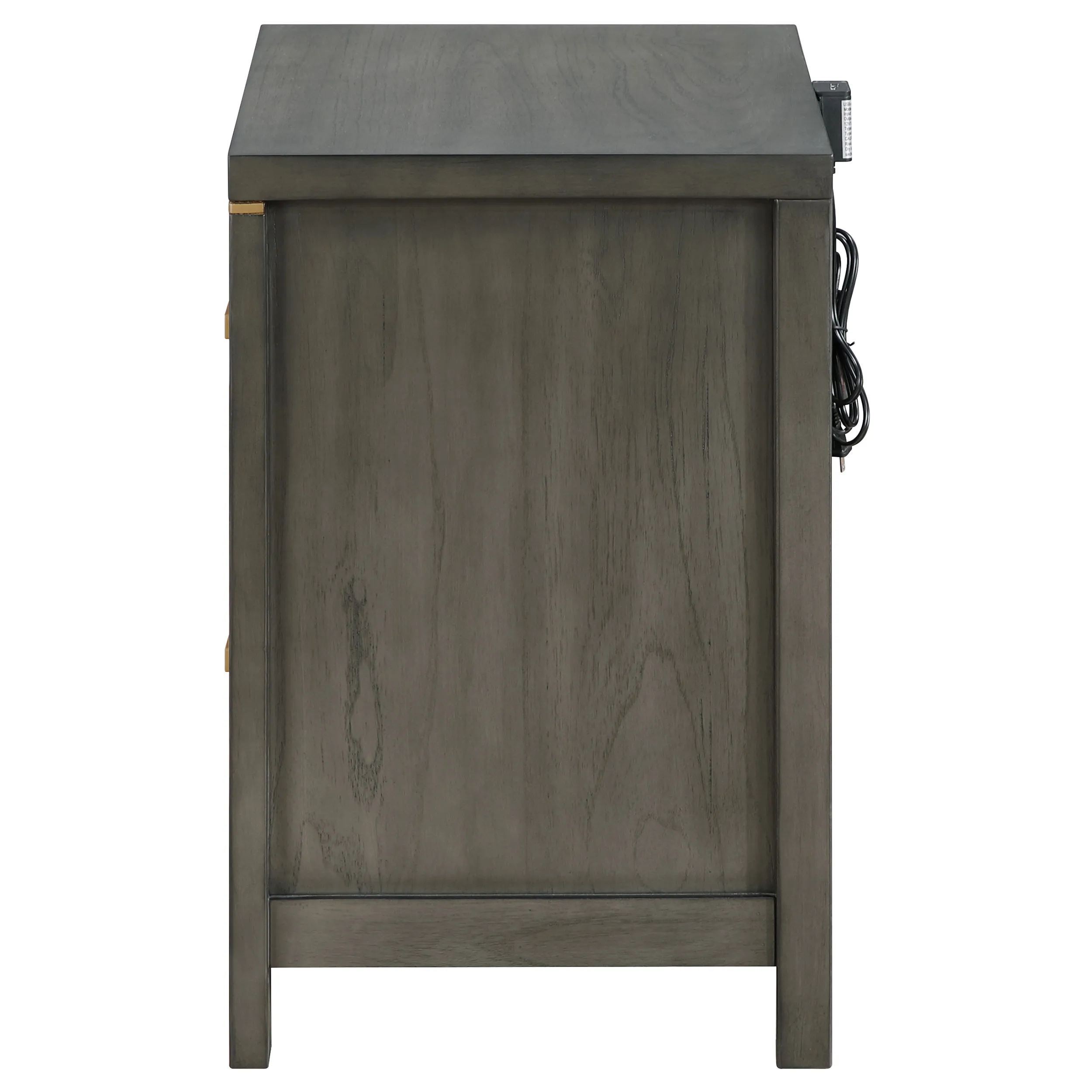 Complete a stylish, inviting bedroom with the refined look of a modern two-drawer nightstand. Its timeless stance showcases a soft gray wood grain finish, with brass toned accents and bar pulls that offer just the right touch of warmth. Its two drawers offer plenty of bedside storage for personal items and essentials, helping to keep your bedroom tidy and neat. The top drawer includes brown felt lining to protect delicate items or electronics, and a built-in USB port helps to keep your phone charged while lounging or overnight. Add a reading lamp to the top of the nightstand for a cozy, welcoming ambiance you’ll love coming home to each night.