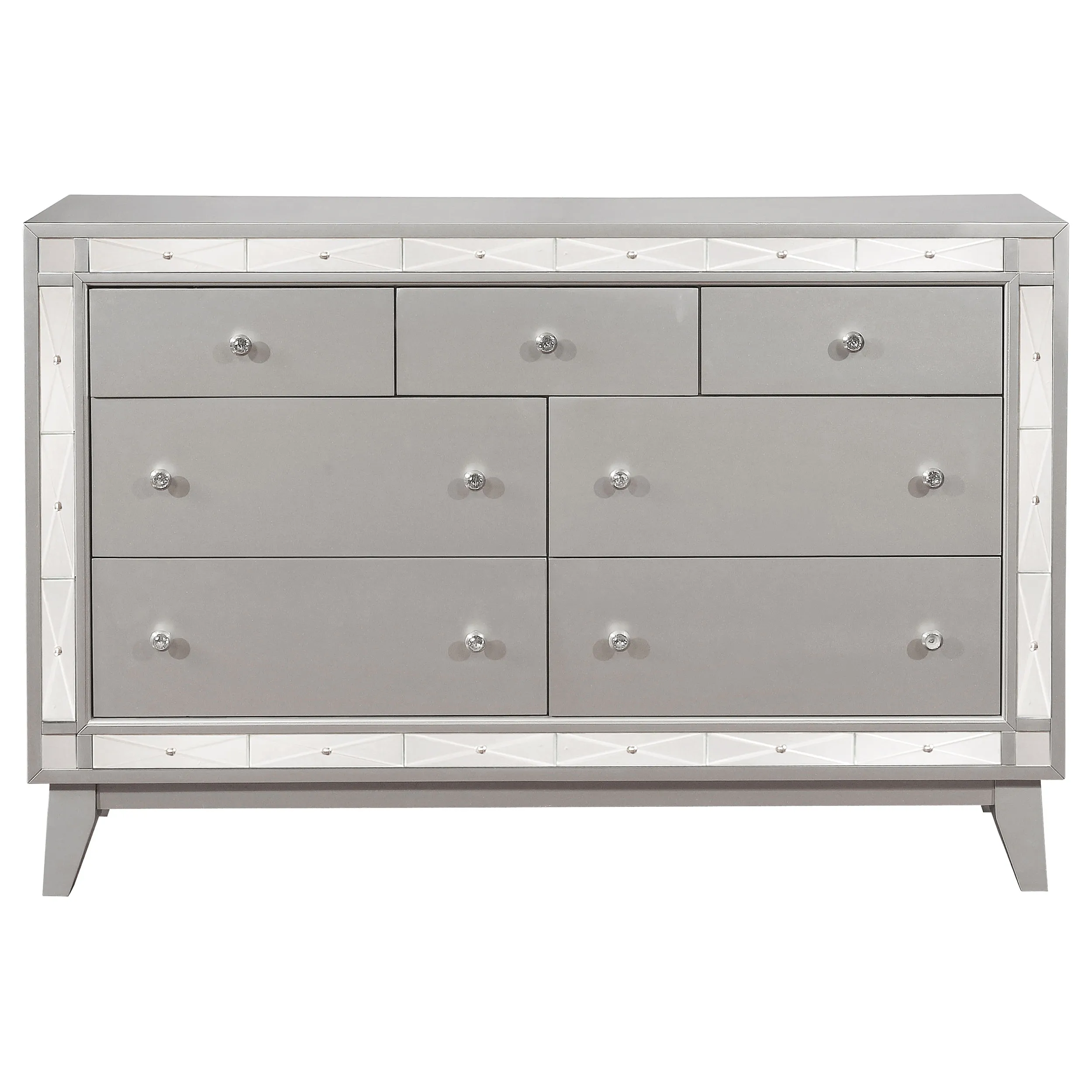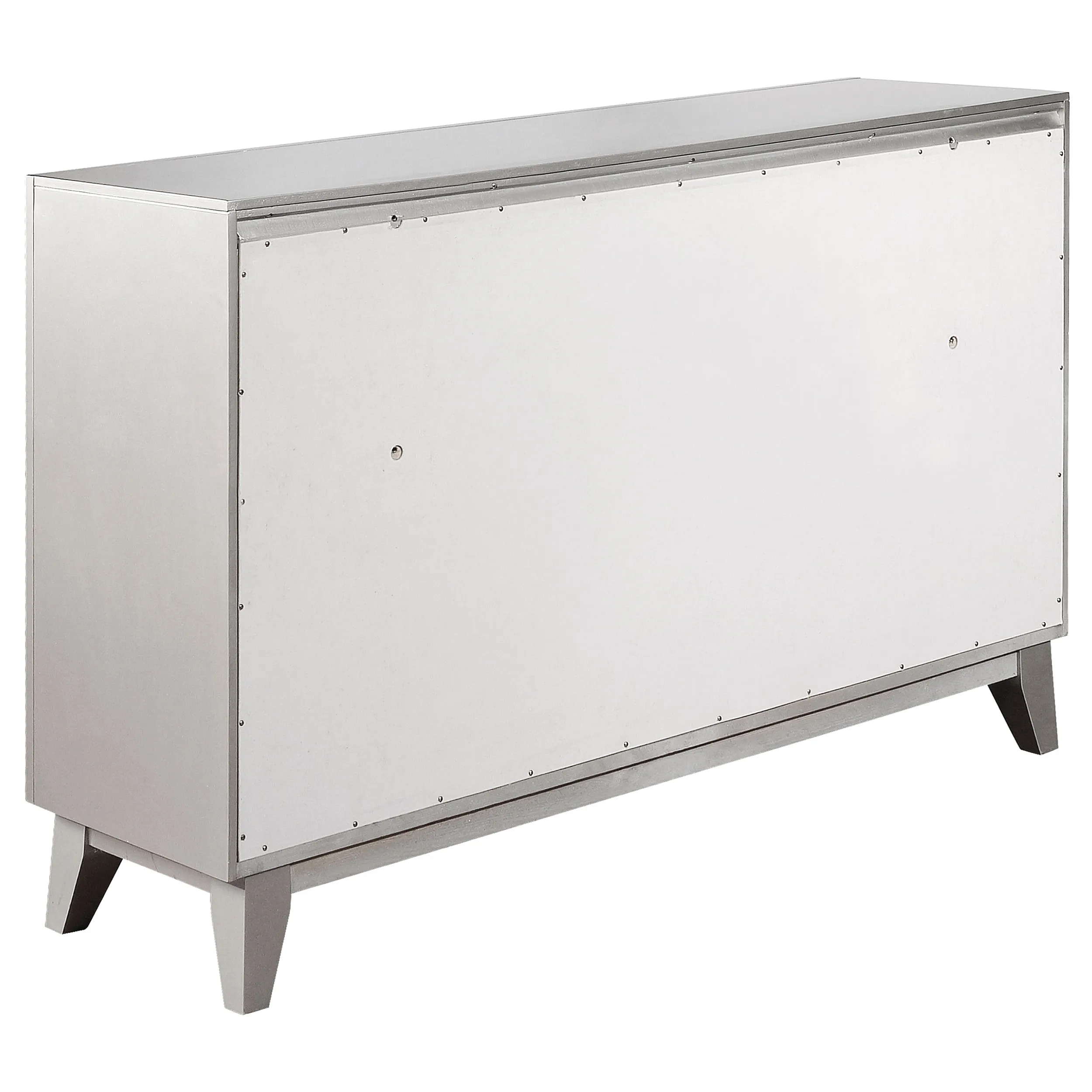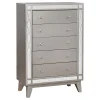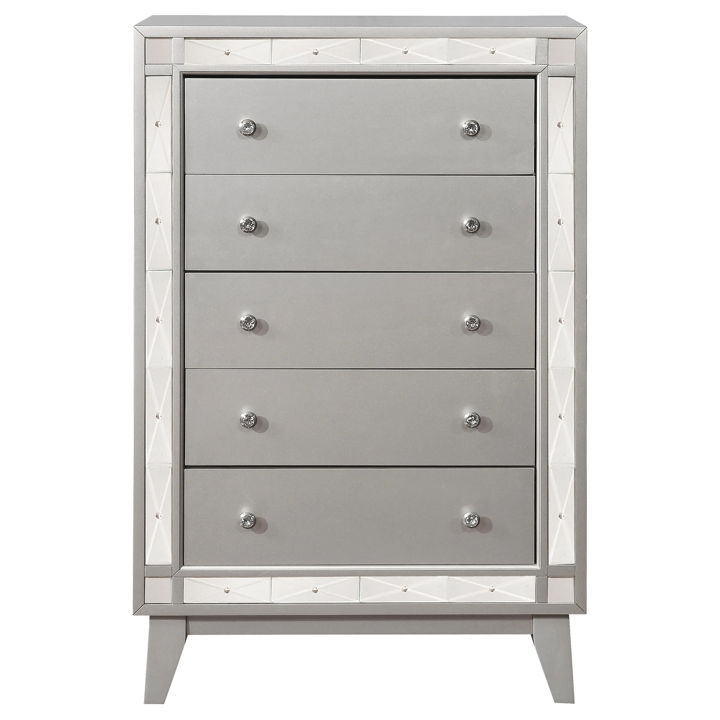 Infuse any bedroom with luxe, glamorous style. This magnificent, five-piece bedroom set will instantly transform your space. Each elegant piece is enhanced by the brilliant, reflective shine of real mirrored panels. The bed is upholstered in metallic leatherette accentuated by beautiful, wave-like patterns. A lovely, metallic finish adds even more shimmering sparkle, rounding out its transitional design with chic, stunning opulence.