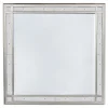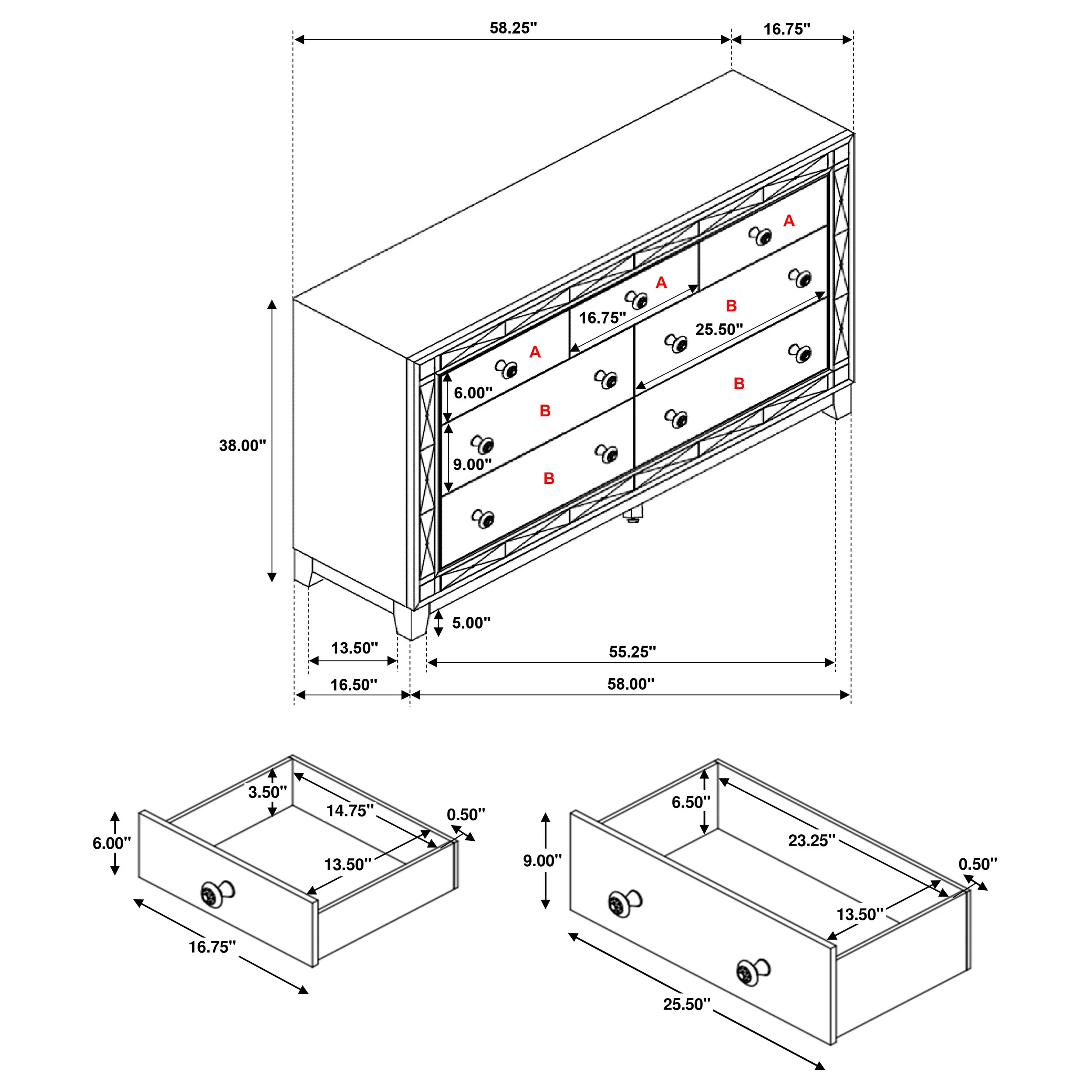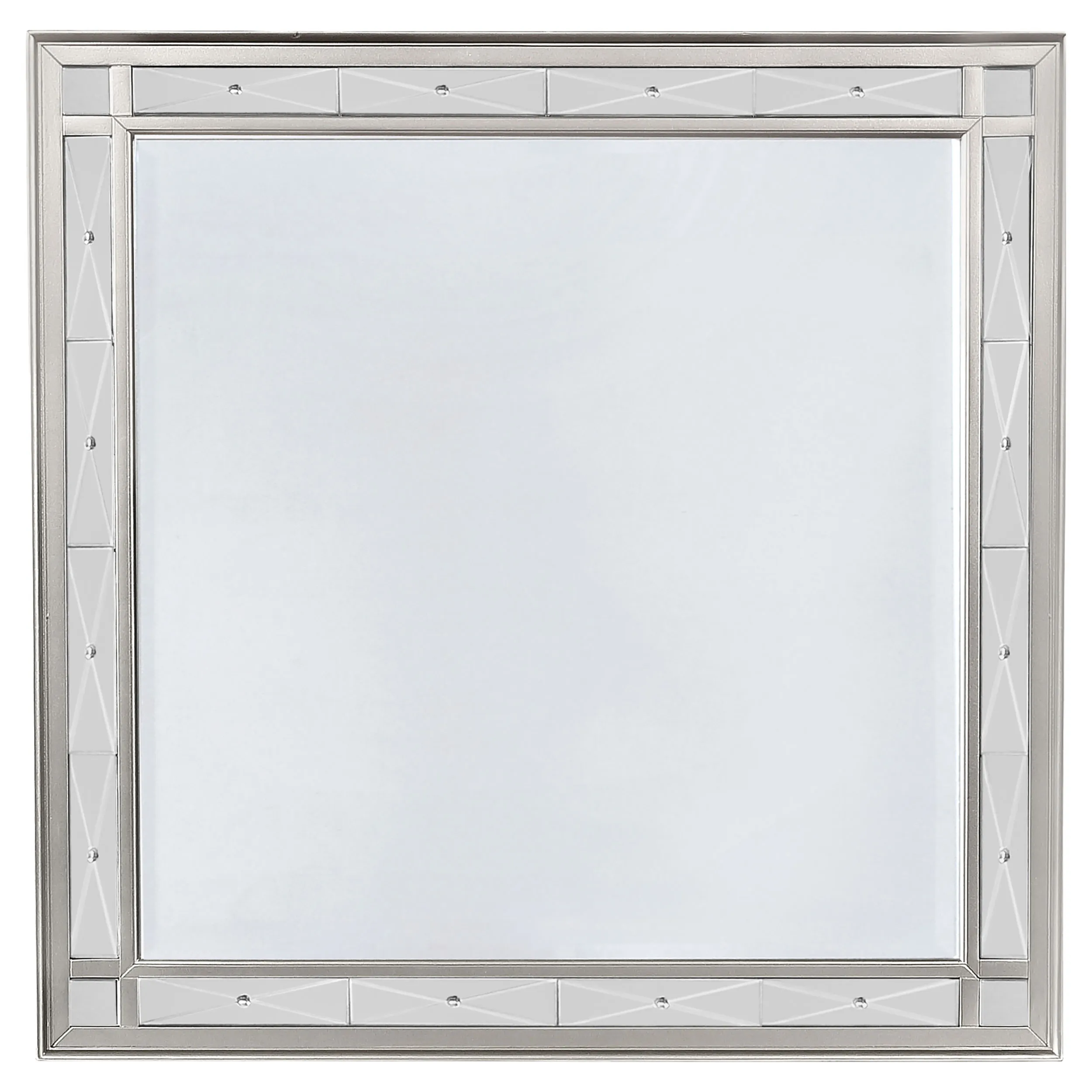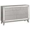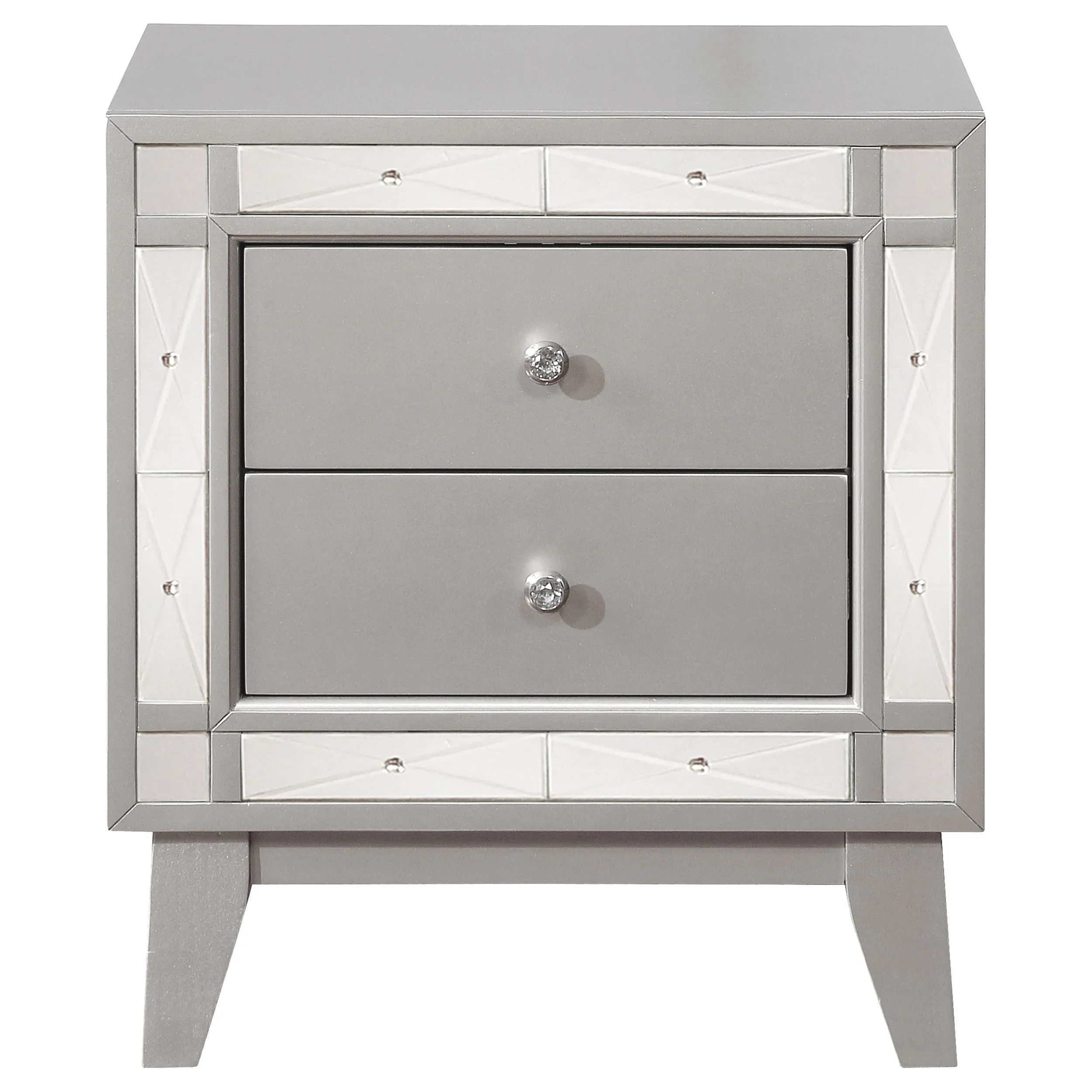 Infuse any bedroom with luxe, glamorous style. This magnificent, five-piece bedroom set will instantly transform your space. Each elegant piece is enhanced by the brilliant, reflective shine of real mirrored panels. The bed is upholstered in metallic leatherette accentuated by beautiful, wave-like patterns. A lovely, metallic finish adds even more shimmering sparkle, rounding out its transitional design with chic, stunning opulence.