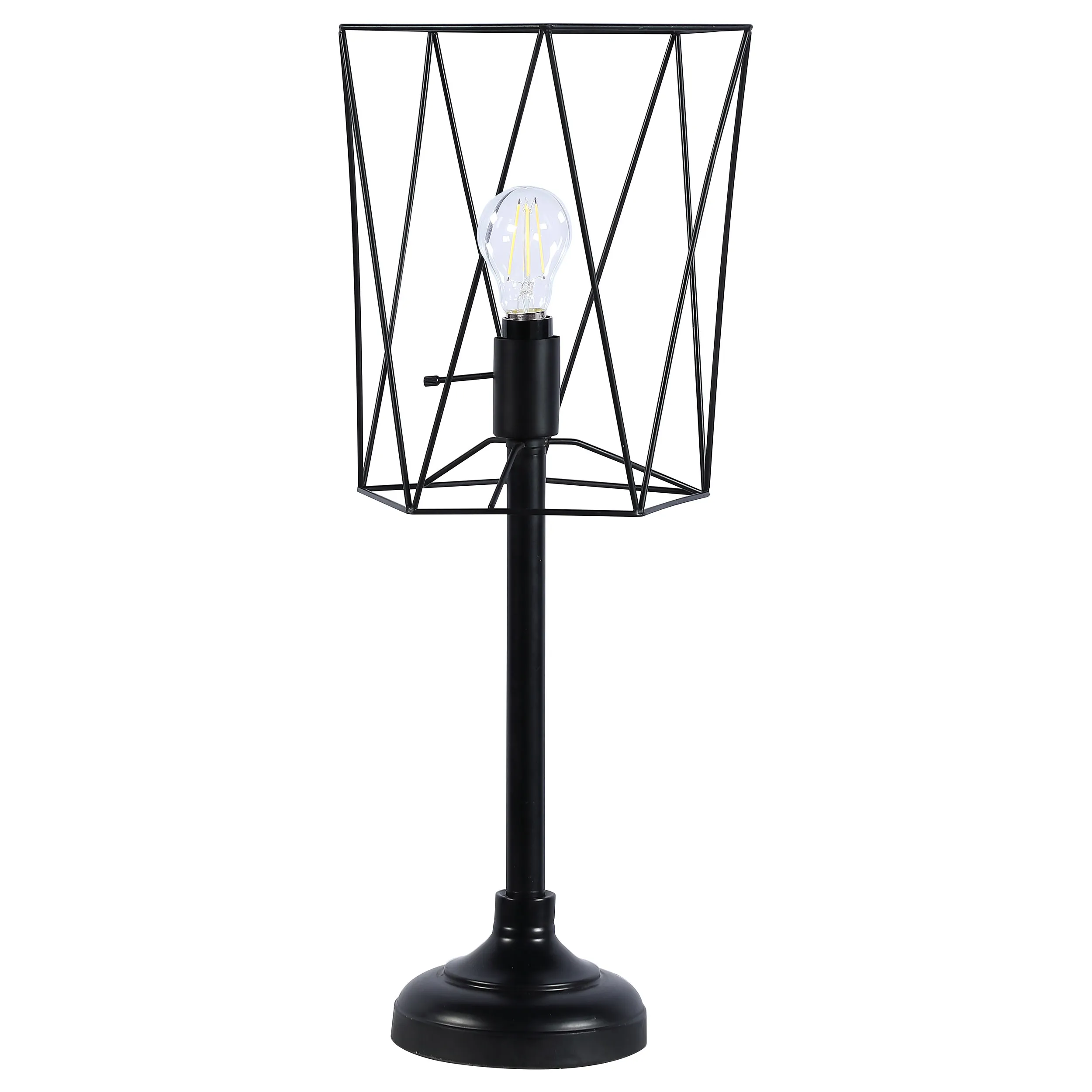 Perfect for a modern style home, this industrial style table lamp features a wire cage design in place of a shade. The cage-like shade allows the Edison style bulb to showcase itself, presenting a vintage-era touch. The slim torch is secured by a round tiered base, each in a shiny metal finish. With a two-way switch, this table lamp can be adjusted to the task at hand. Place it on a desk for a retro-inspired workstation.