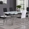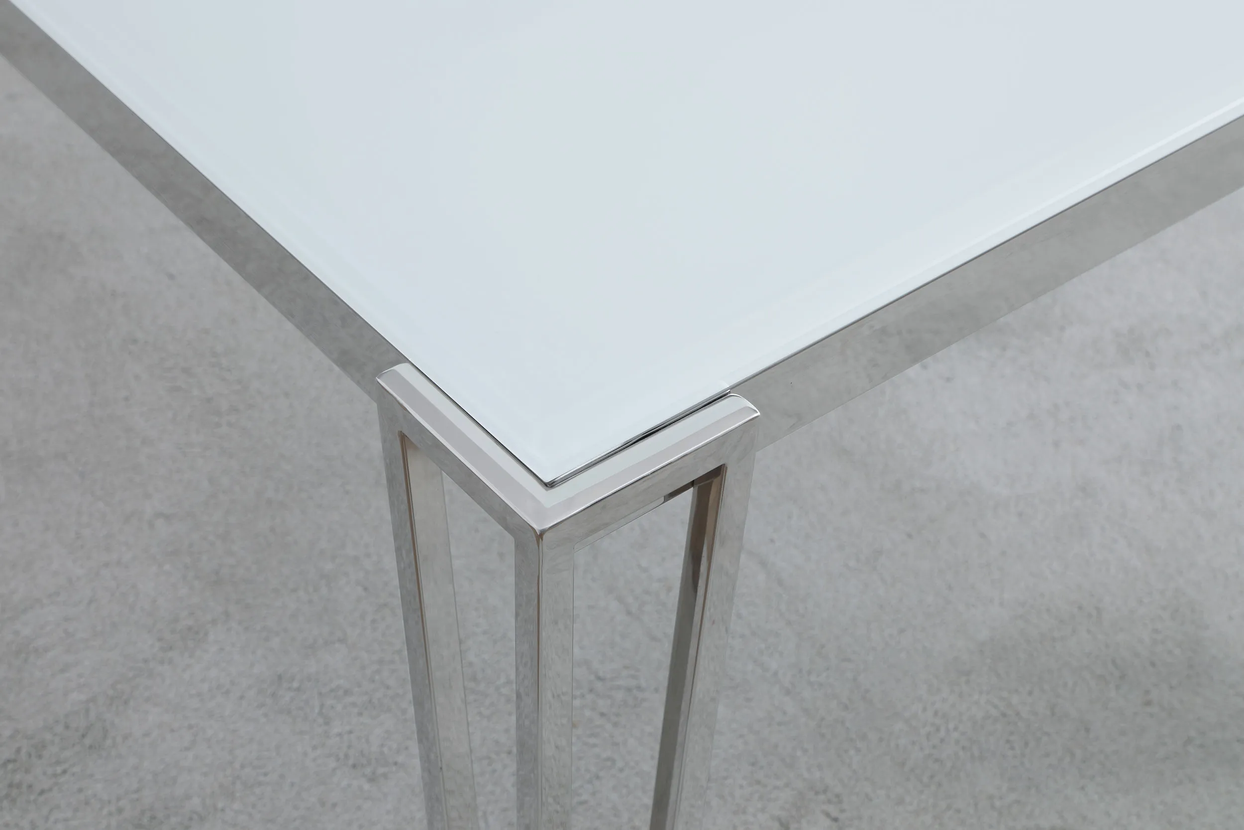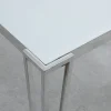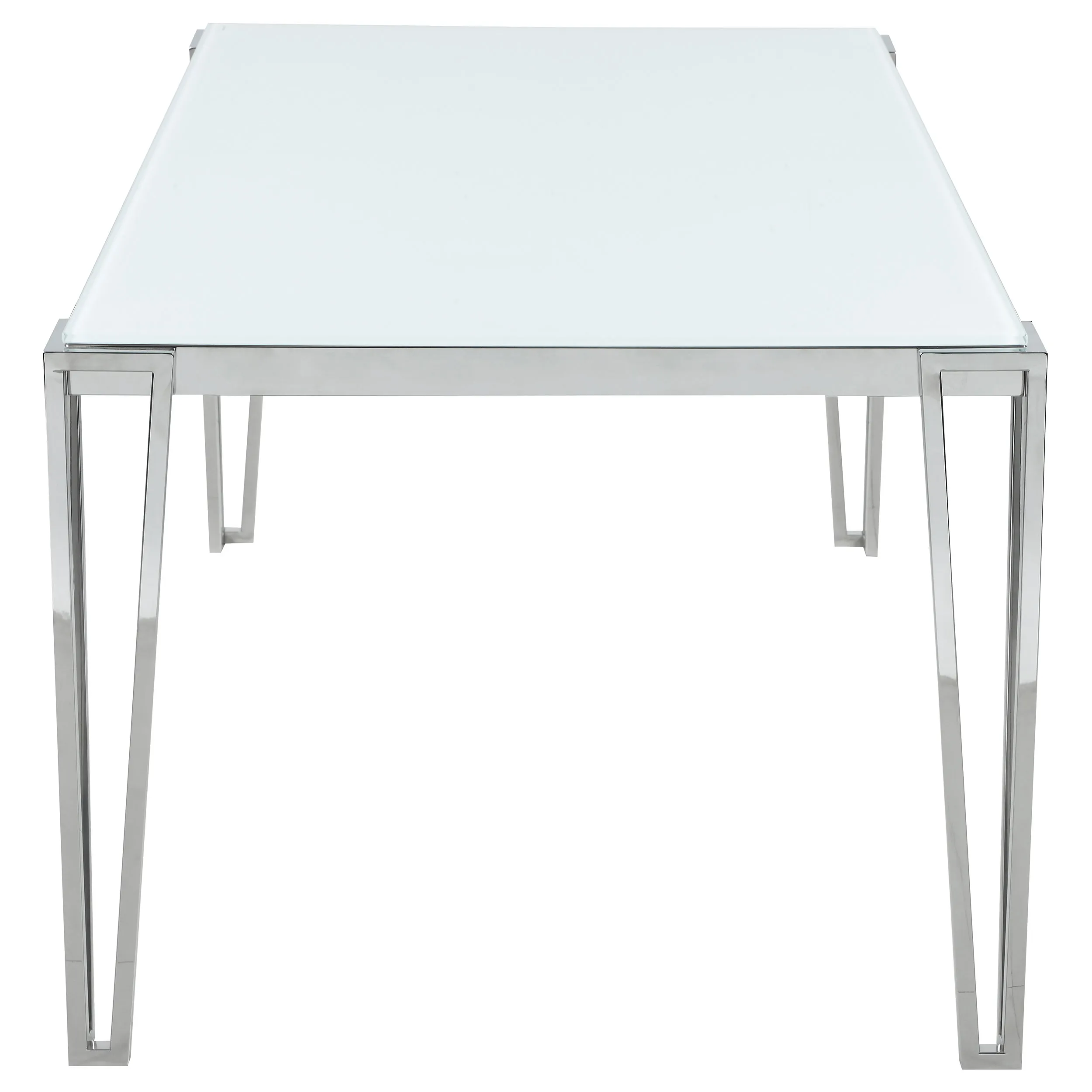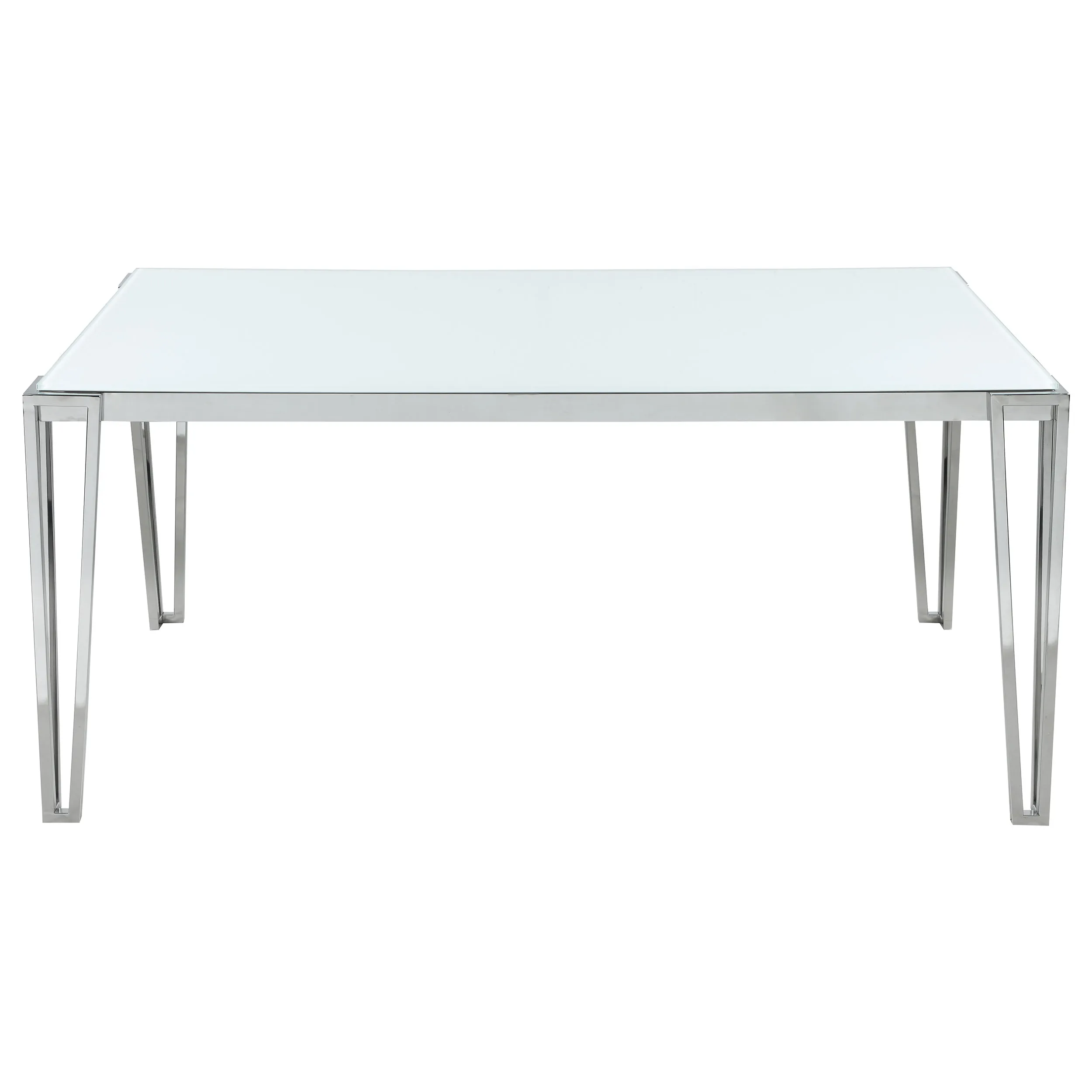 Perfect for contemporary dining rooms, this rectangle dining table offers seating for up to six guests. Designed with clean lines and a minimal silhouette, this table can be used a more casual modern piece or elevated into a formal dining table. Built of sturdy stainless steel metal with a polished chrome finish, it’s easy to maintain and made to last for many years in the home. Each hairpin-inspired leg is made modern with slim corner brackets. Rested on top of a white frosted tempered glass tabletop surface that can complement your home’s already existing colors.