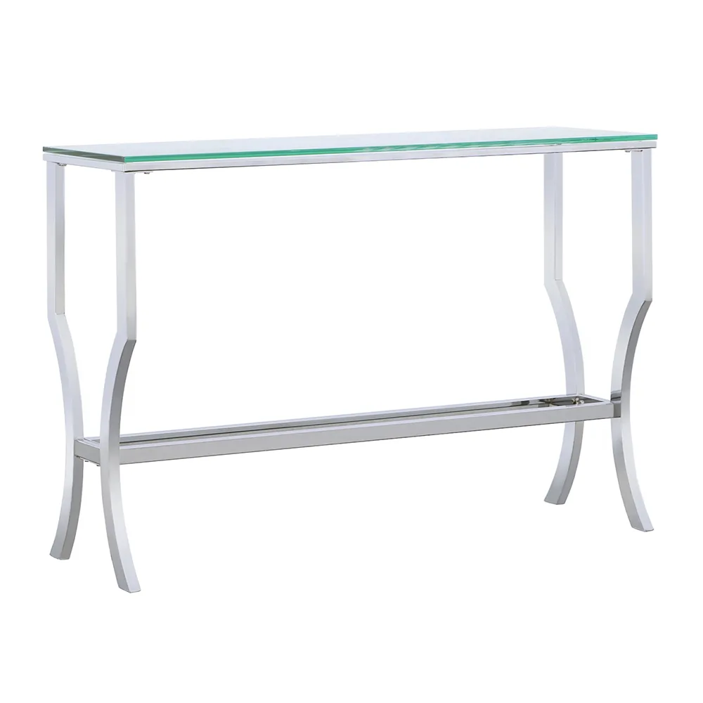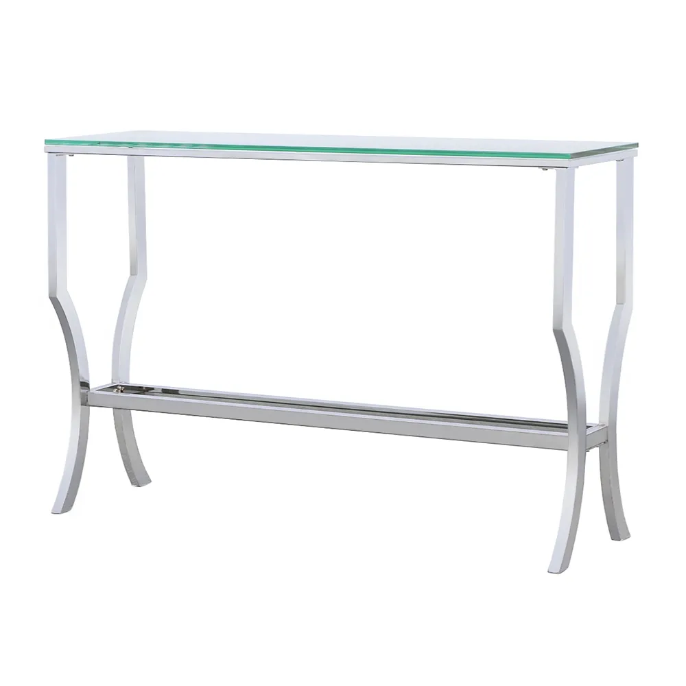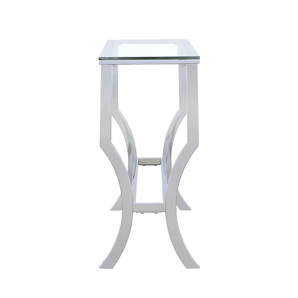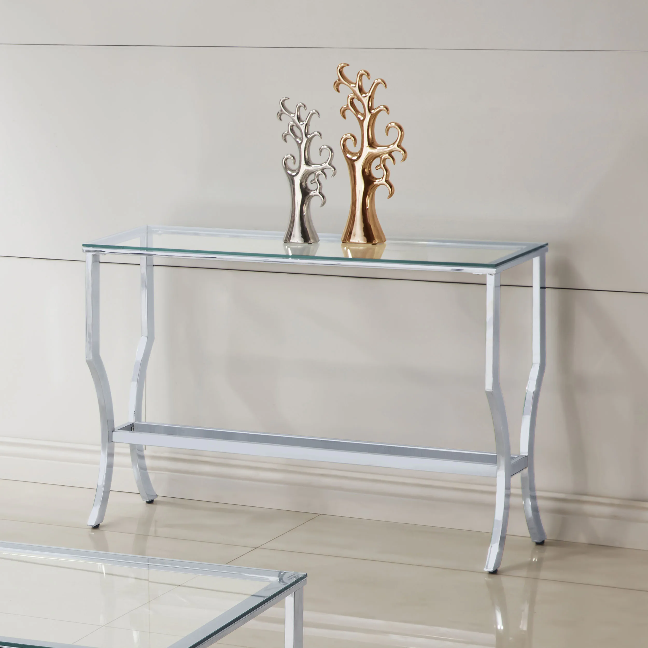 Extend a glamorous motif throughout an entryway with the charming radiance from this chrome sofa table. Elongated in silhouette, the rectangular glass top is great for adding an open and airy feel. The bright and reflective shine of metallic bliss gives this modern piece its chic personality. Delicately curved, the hourglass-inspired silhouette of the legs welcomes a feminine French-inspired feel. Add structure with the built-in storage shelf featuring mirrored details.