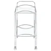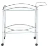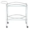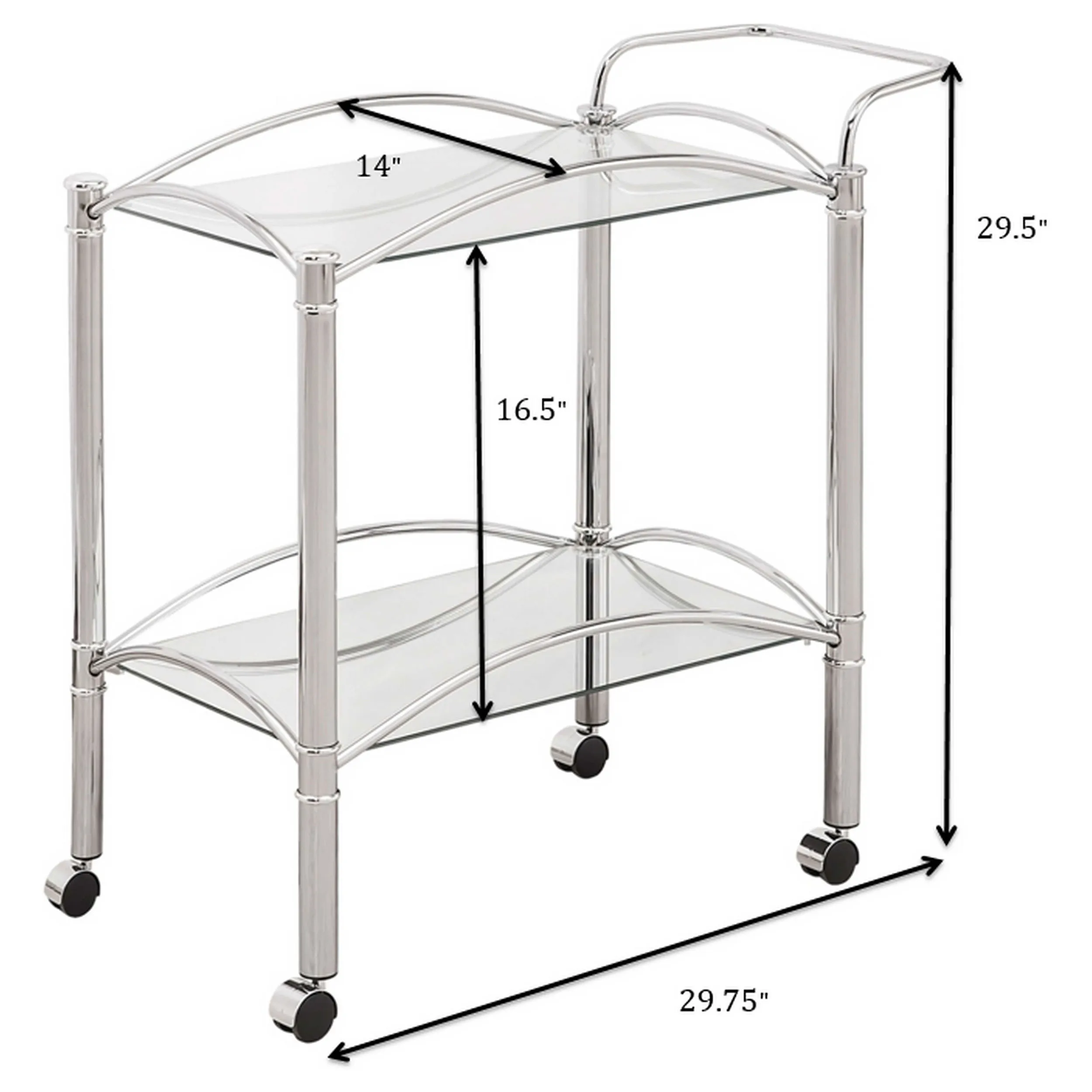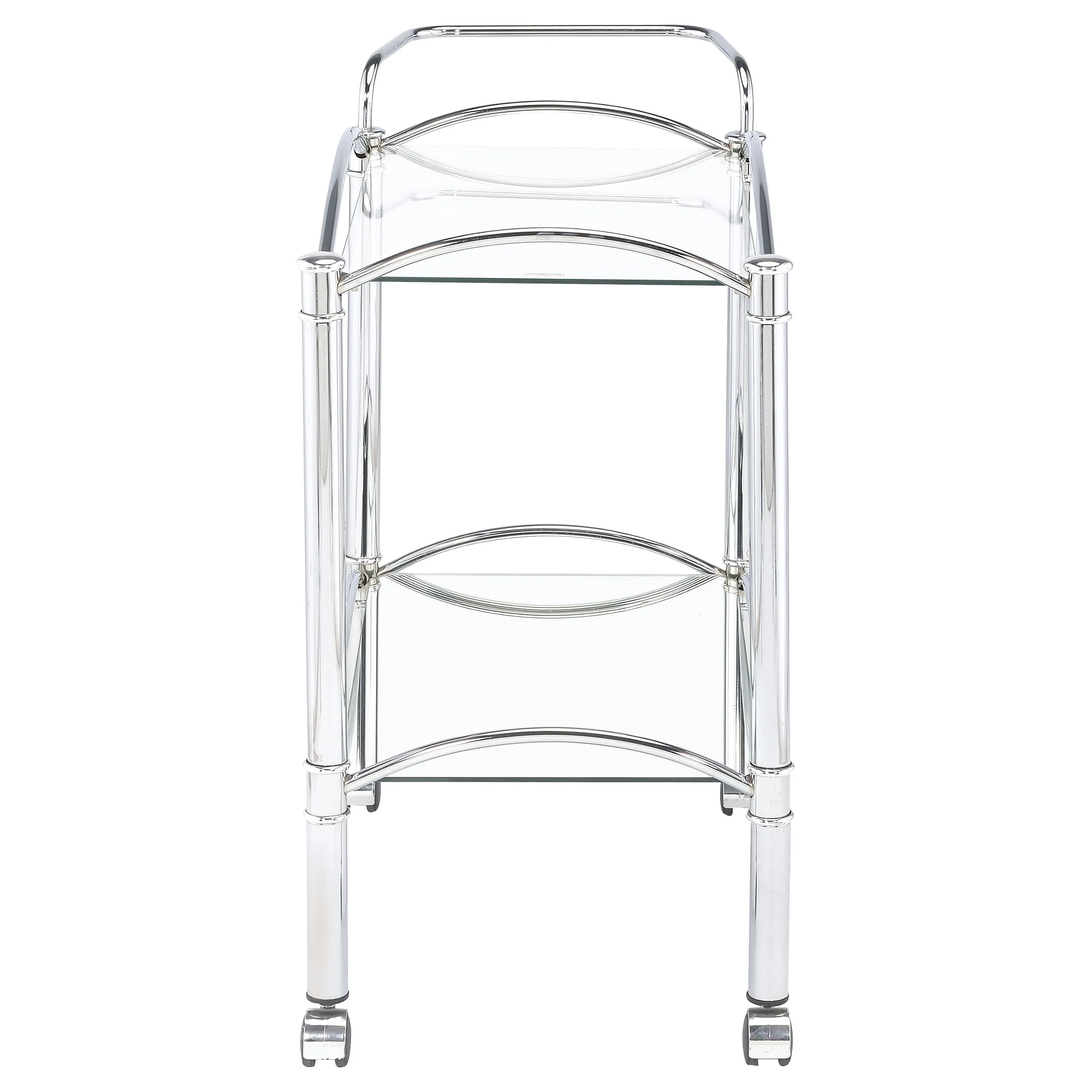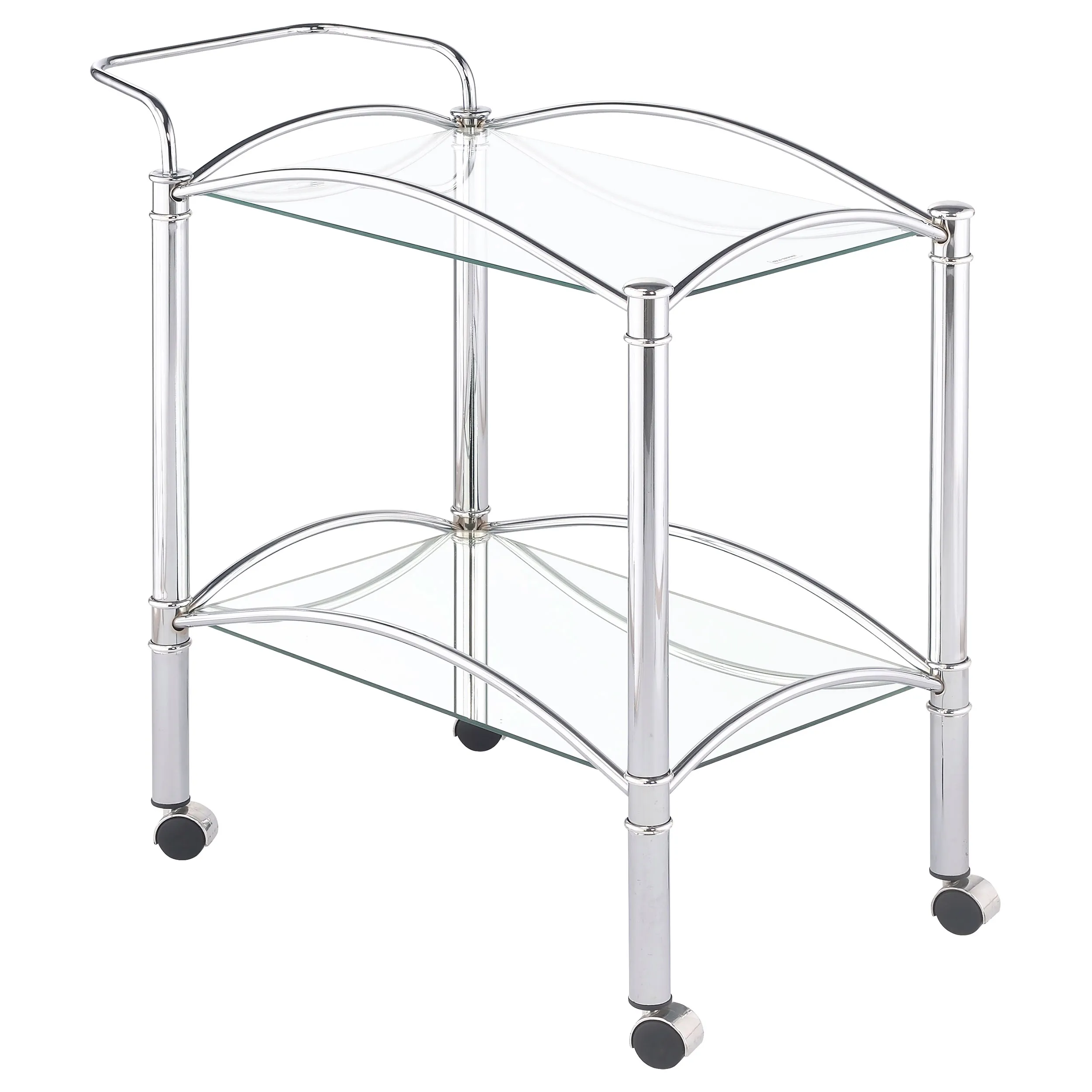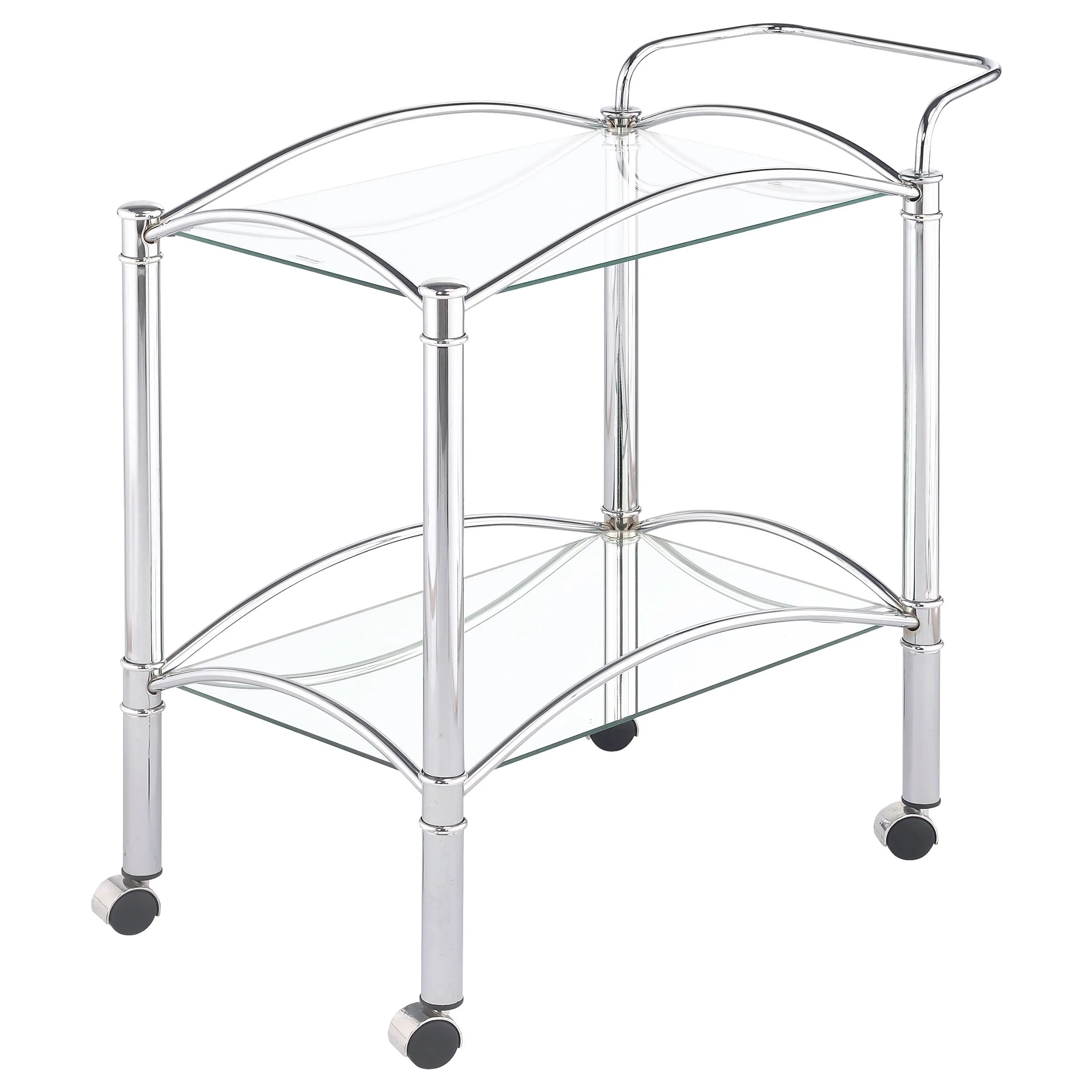 Simple elegance with a modern twist. This freshly styled serving cart offers a tasteful addition to contemporary decor. With a sleek chrome finish, its metal frame receives romantic curved accents. A tempered glass top shelf and mirrored bottom shelf accommodate beverages, food, and implements. Casters allow mobility to work the room easily.