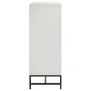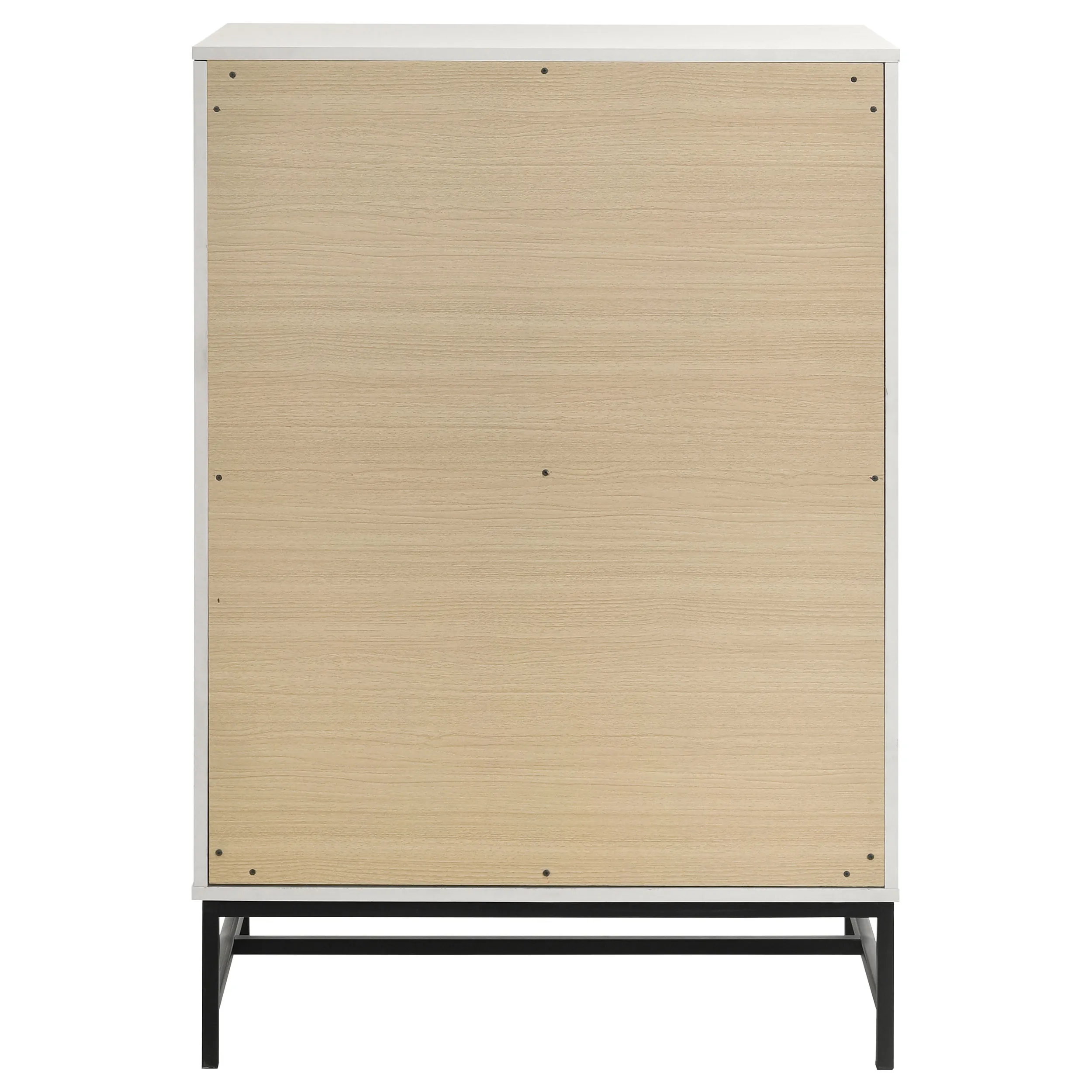 Create ample storage with the compact footprint of a modern four-drawer chest. Its roomy drawers are ideal for clothing, linens, and accessories, helping to keep your personal space tidy and organized. A white finish complements straight, clean lines, while black hardware adds contrast and depth. complementary metal base in black adds light, airy ambiance. Use the top for decor like photos, or add a jewelry box for a personal touch.