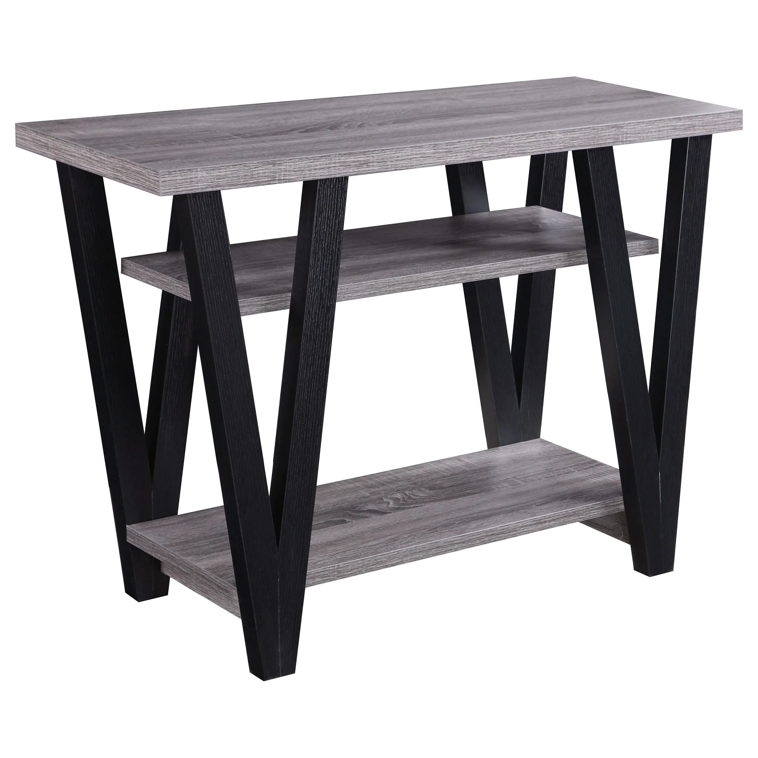 This impressive sofa table is crafted with mid-century modern sensibility that you’ll appreciate. The big grey rectangular table top easily fits a table lamp and a volume of books. Two shelves below provide extra storage for a laptop and modem or simply decorative accessories. The four legs are finished in black with a V-shaped design that lends an extra vibrancy. Its prominent design and contrasting color pattern give it the versatility to match any decor.