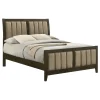 This panel bed adds a luxurious touch to your bedroom with its bold vertical channel tufting on the padded headboard and footboard. The dark cocoa finish complements the soft brown fabric upholstery, creating a warm, inviting aesthetic. The clean lines and vertical detailing provide a sleek, contemporary look while maintaining an air of sophistication. Crafted from high-quality materials, this bed offers both durability and style, making it the perfect centerpiece for your bedroom. Its sturdy design ensures comfort and long-lasting appeal.